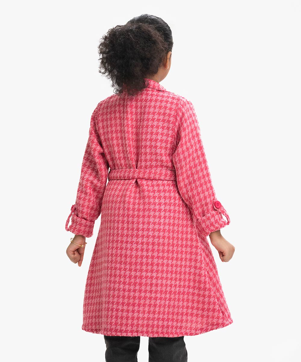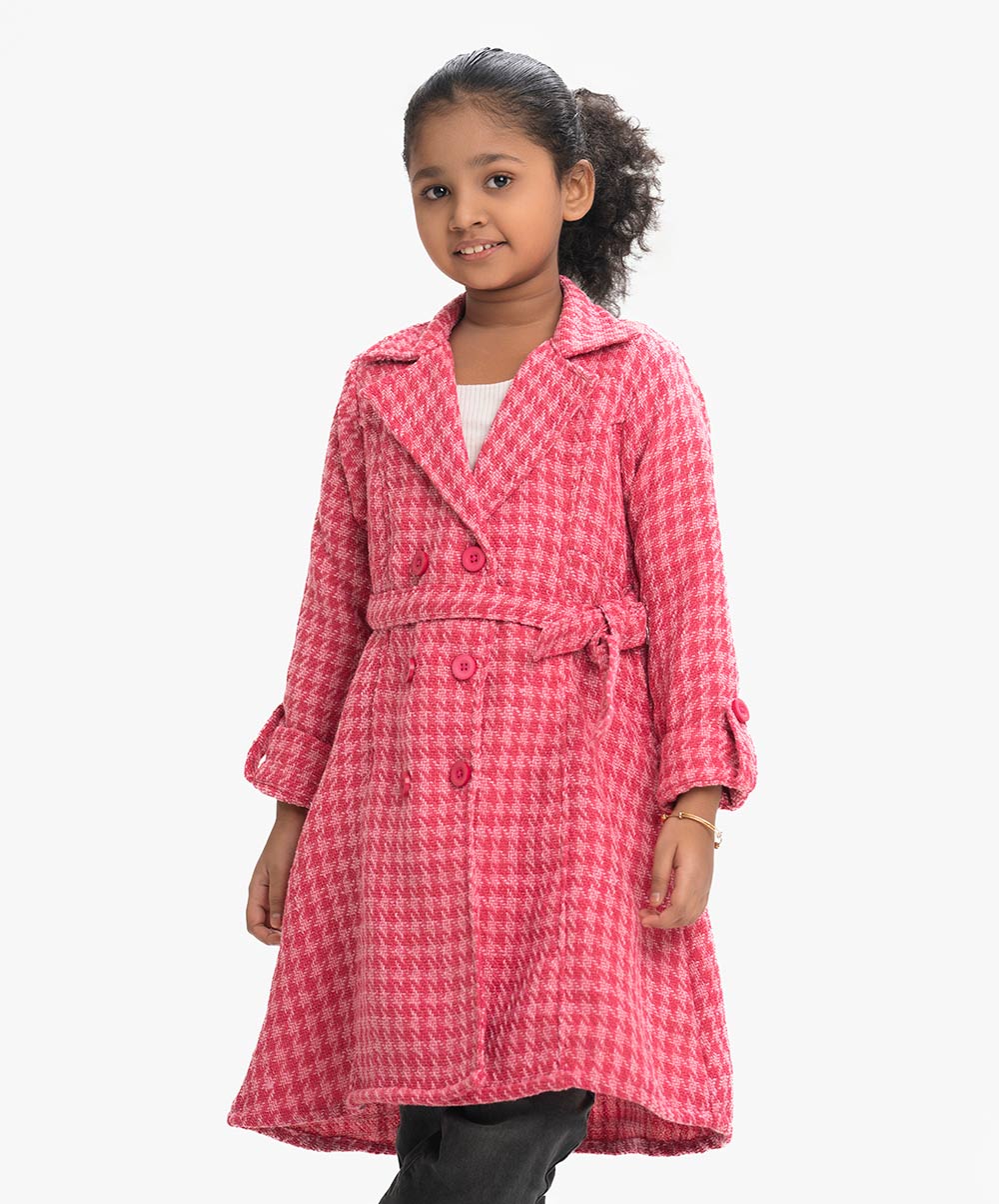 Kid girls double-breasted A-line jacket in blended knit fabric. Lapel collar, roll-up sleeves and waist belt.