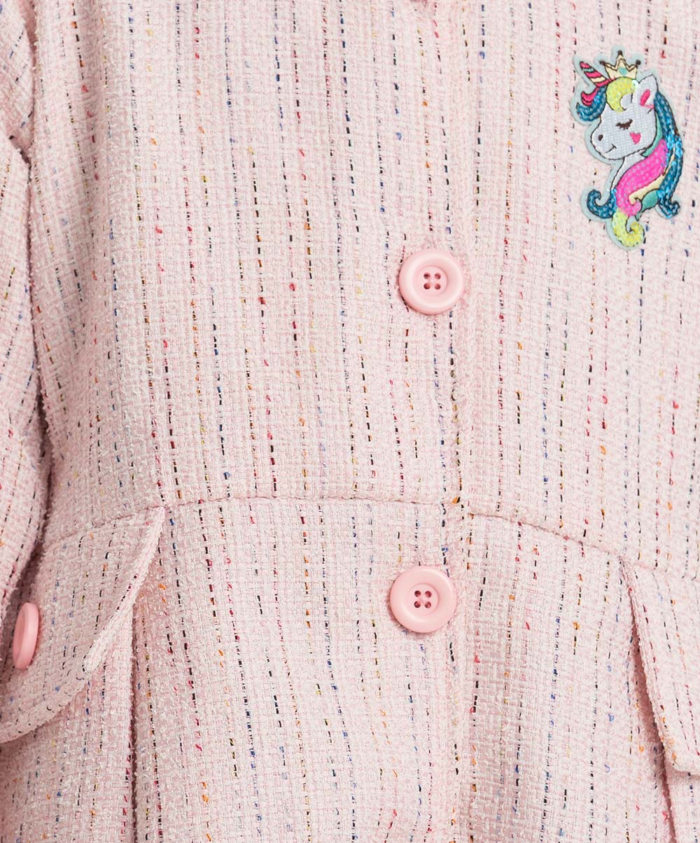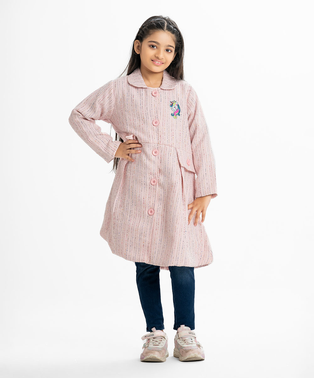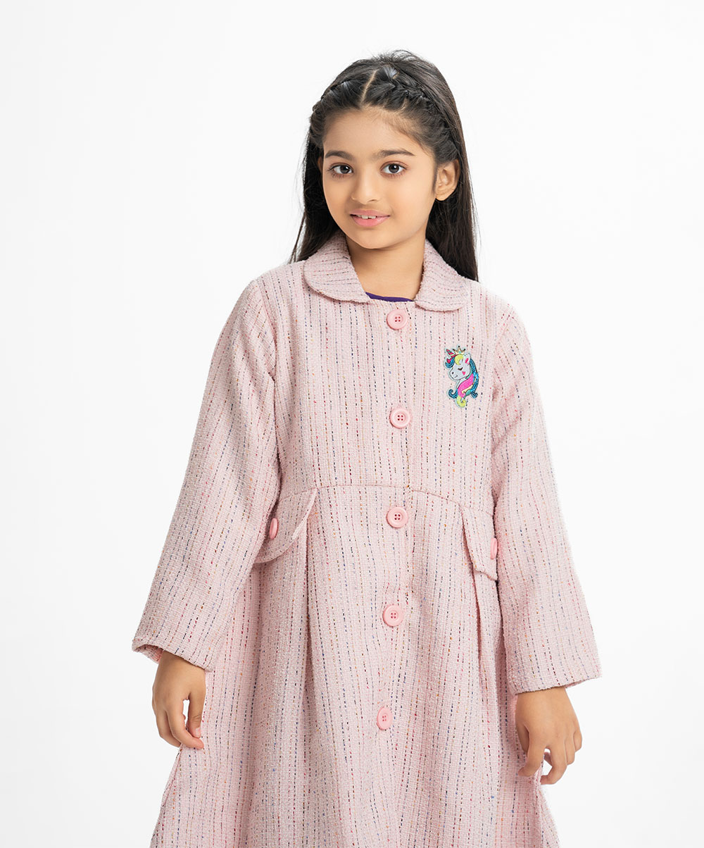 Kids A-line jacket in tweed fabric. Long sleeves, Classic collar. Button fastening at the front and two pocket flaps