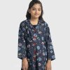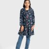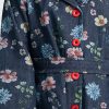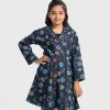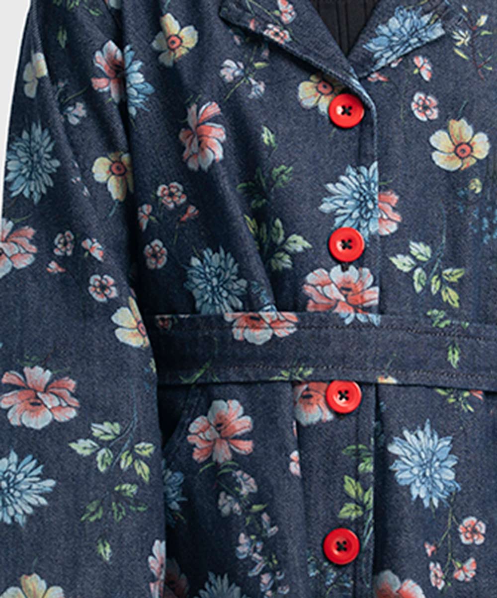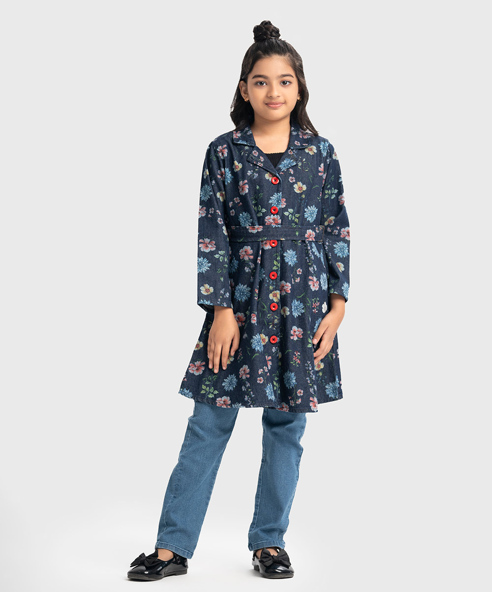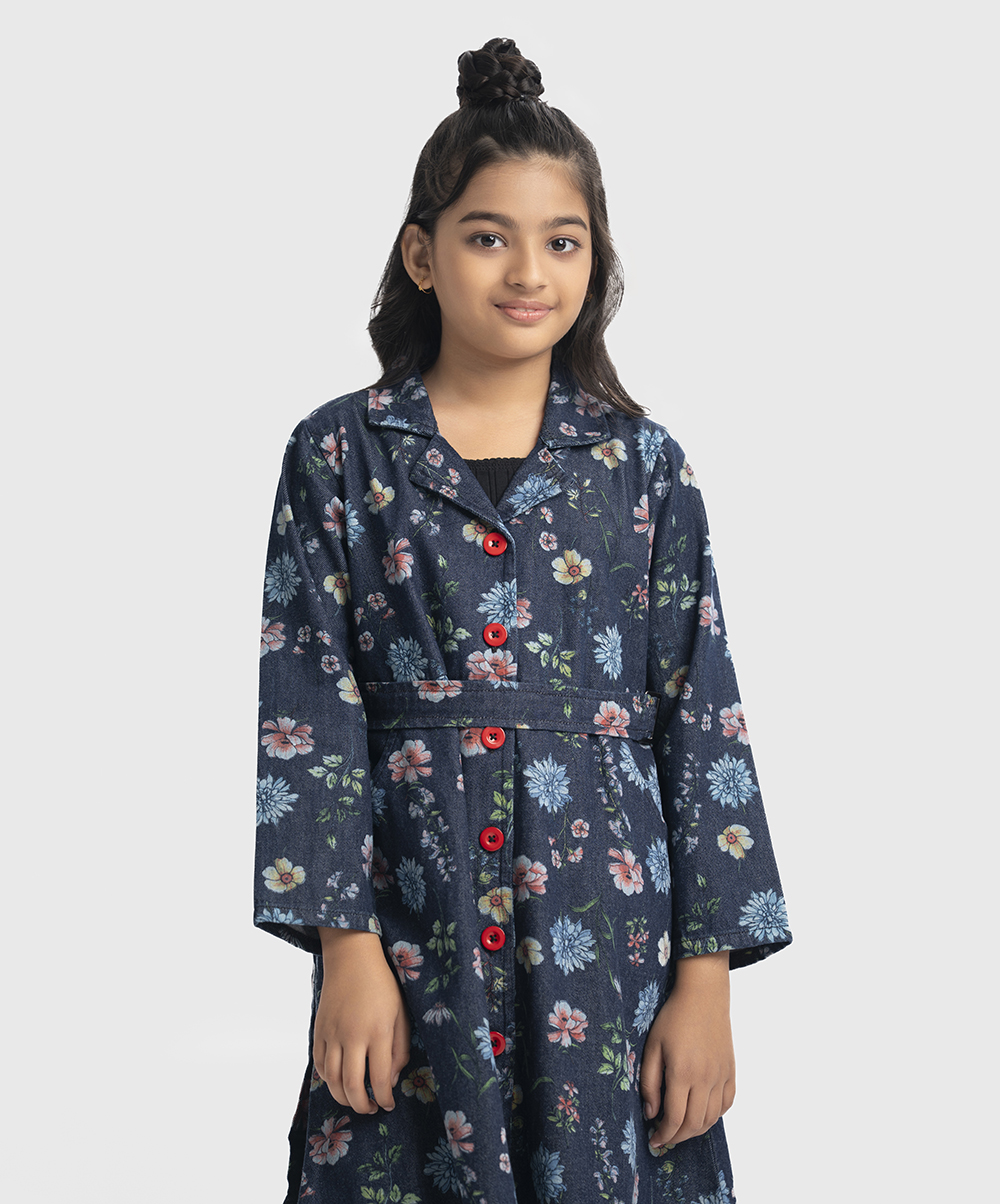 Kid girls floral printed A-line jacket in denim fabric. Lapel collar, long sleeves. Buttons fasten at the front and waist belt.