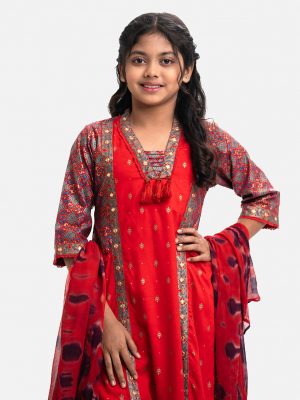 Red viscose kameez with allover print, metal embellishment at front and karchupi on front yoke. Comes with light brown printed viscose dhuti salwar and tie-dyed dupatta.