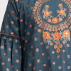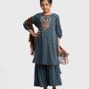 Trendy shara kameez set in joom fabric. Round neck, lantern sleeved kameez with high-low hemline and embroidery at the front. Half viscose lining inside. Complemented with an elasticated waist sharara.