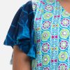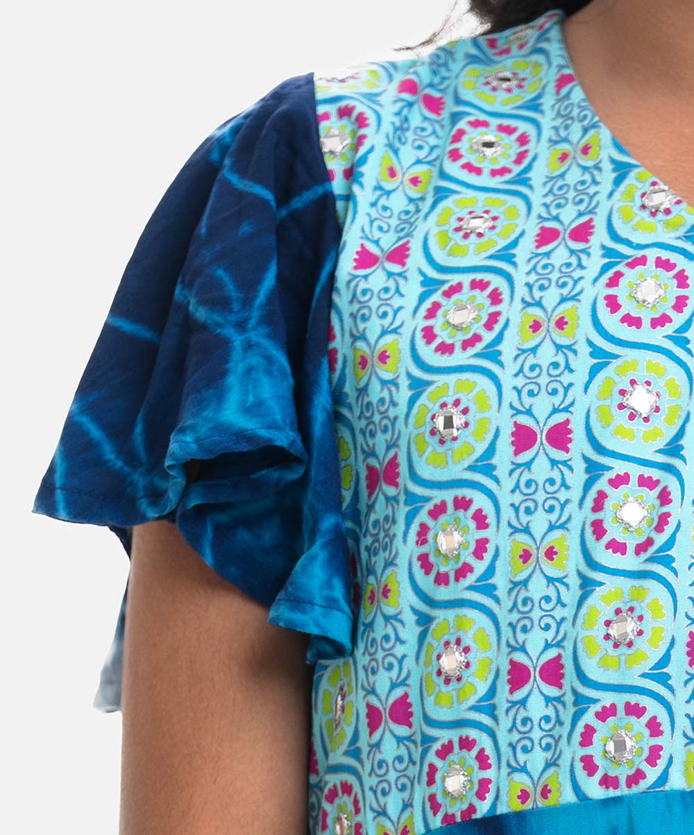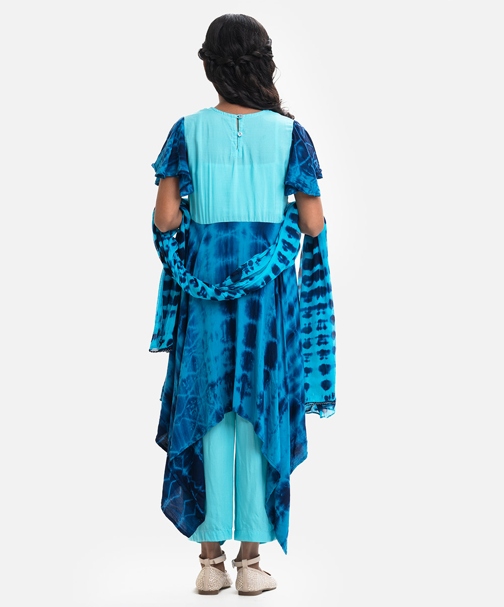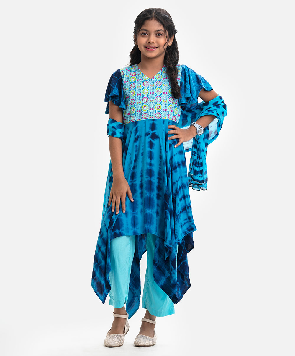 V-neck A-line kameez in viscose fabric. Tie-dye printed, embroidered at the front, flounce-sleeved. Complemented with a pant pajama and a matching dupatta.