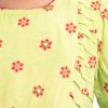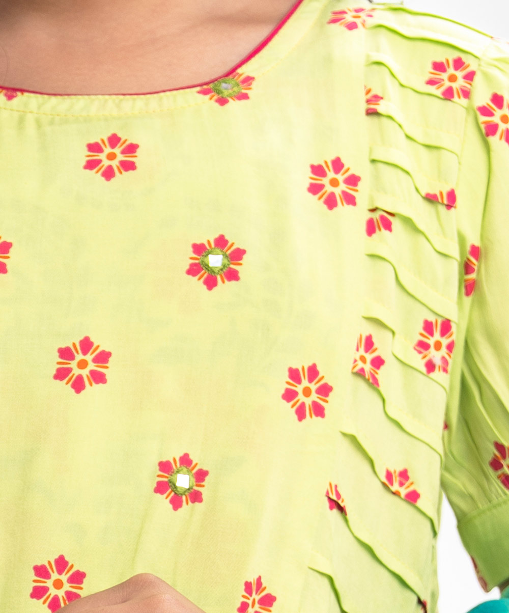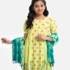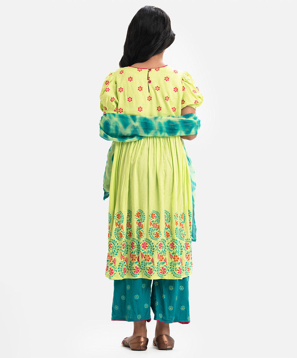 Round neck A-line viscose kameez with puff sleeves and embroidery. Patterned petal viscose pajama. Comes with a matching dupatta.