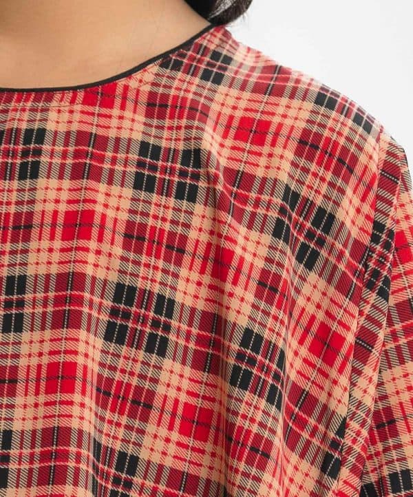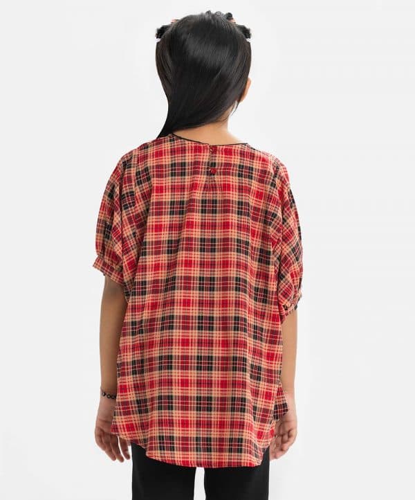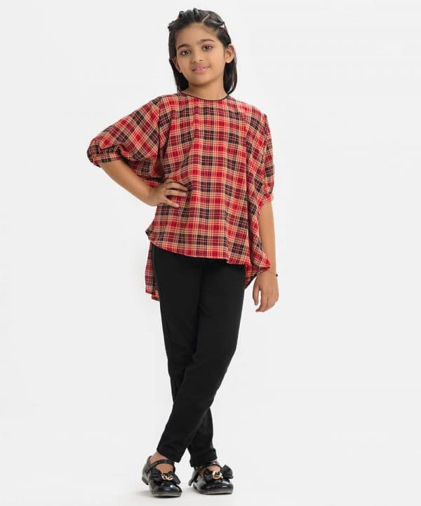 Kid girls plaid check kaftan style tunic in georgette fabric. Round neck, batwing sleeves and high low hem.