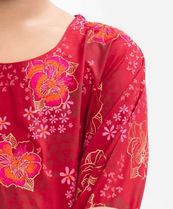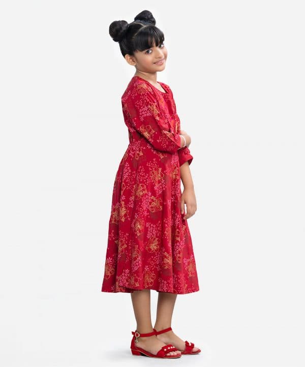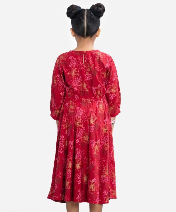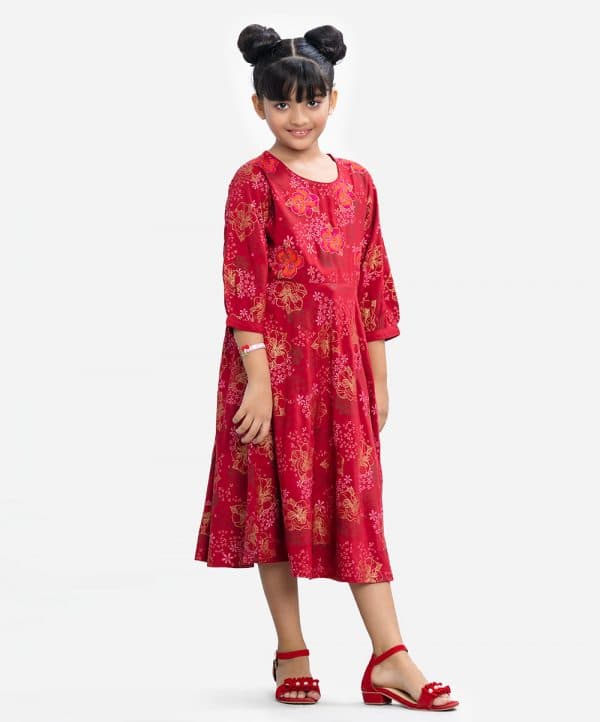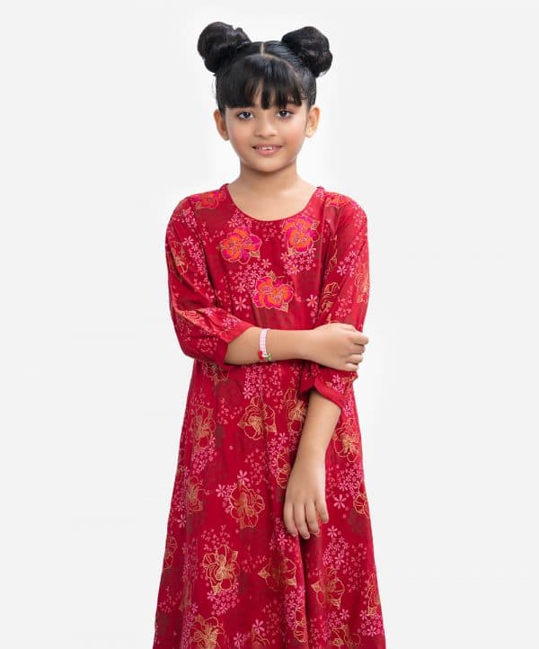 Kid girls floral printed A-line tunic in viscose fabric. Three quarter sleeves, round neck and embroidery at front.