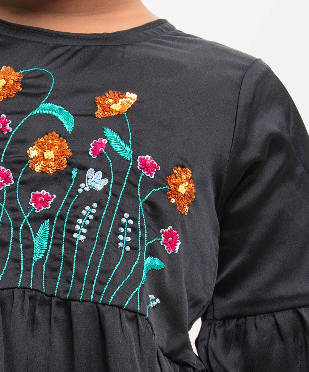 Kid girls’ flared style tunic in crepe fabric. Round neck, lantern sleeves and karchupi at the front.