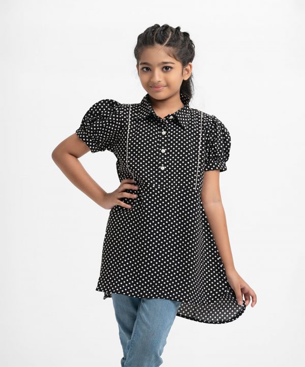 Kid girls’ polka dot printed A-line tunic in georgette fabric. Classic collar, puff sleeves and button fastening at the front.