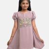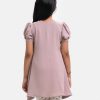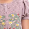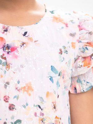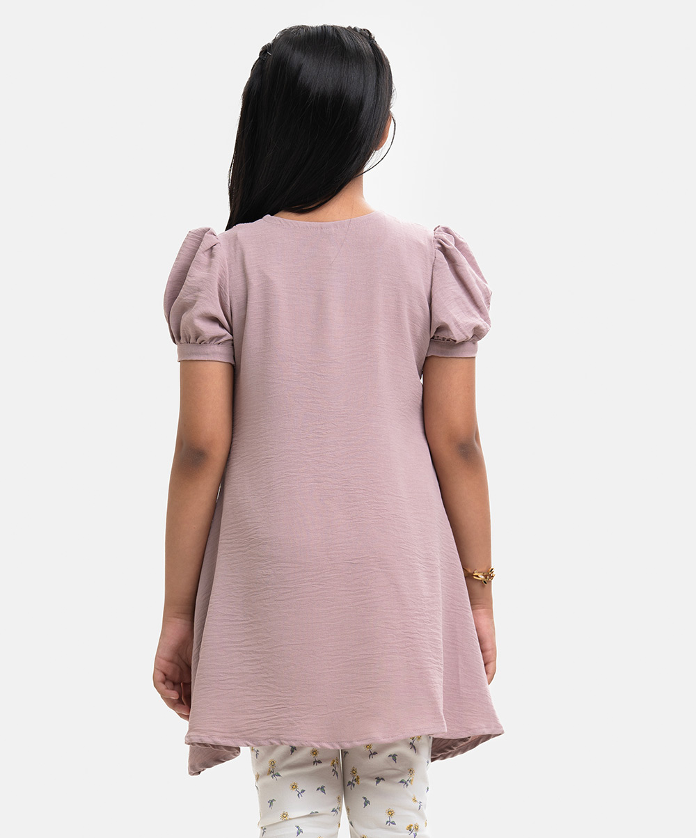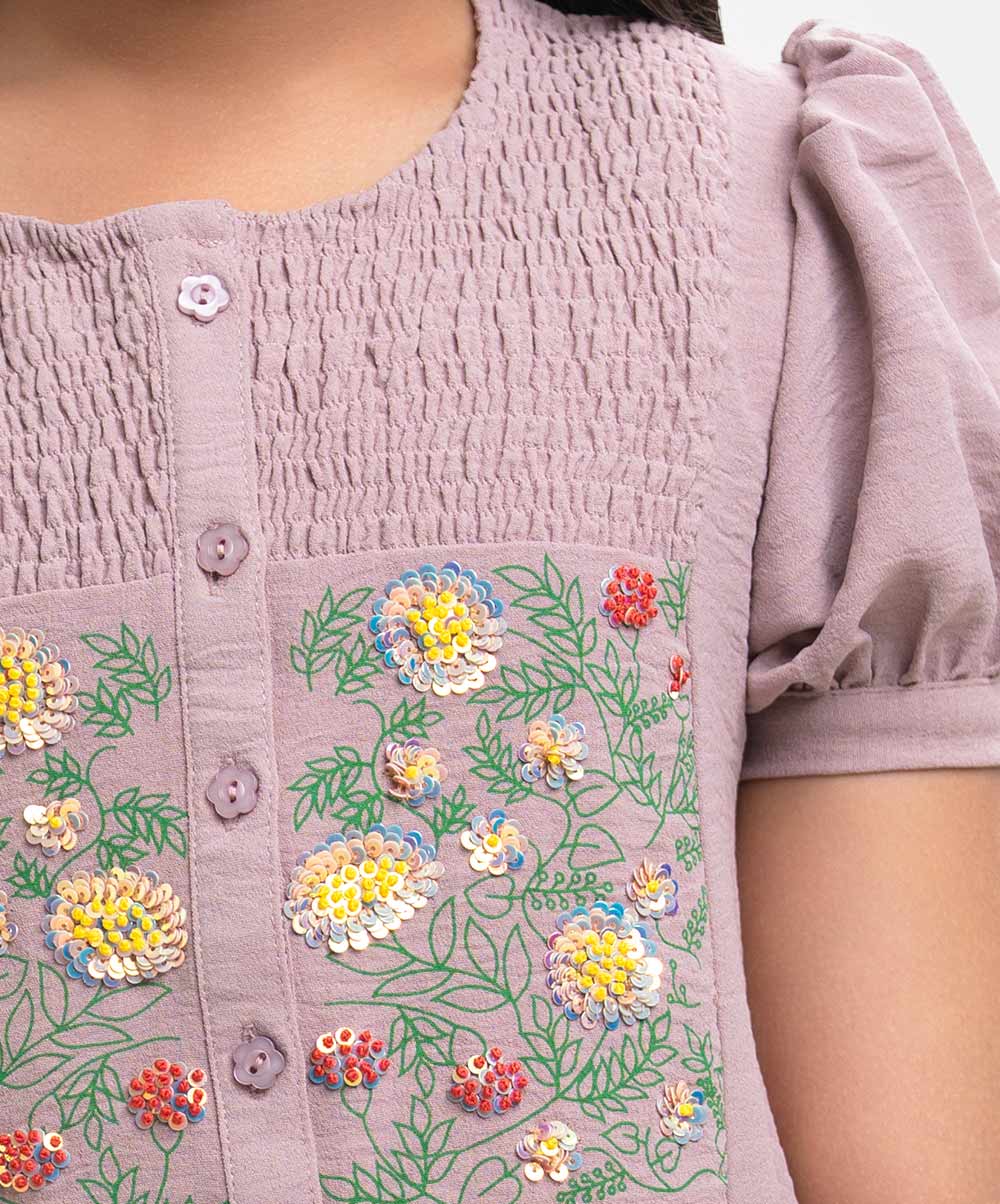 Round neck tunic in georgette-blend fabric. Patterned, puff sleeves, smock and karchupi details at the front.