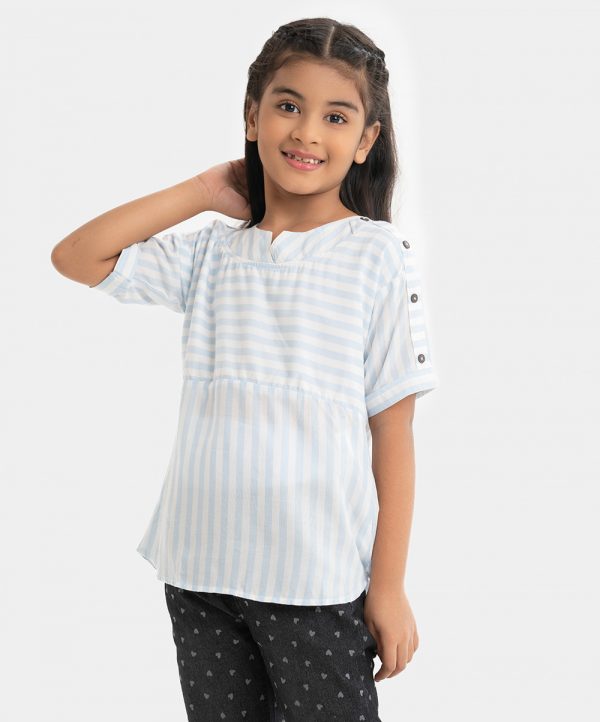 Kid girls’ short tunic in cotton stripe fabric. Round neck, short-sleeves and button at yoke.