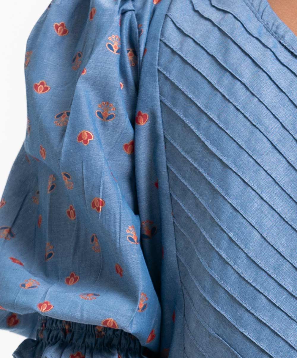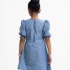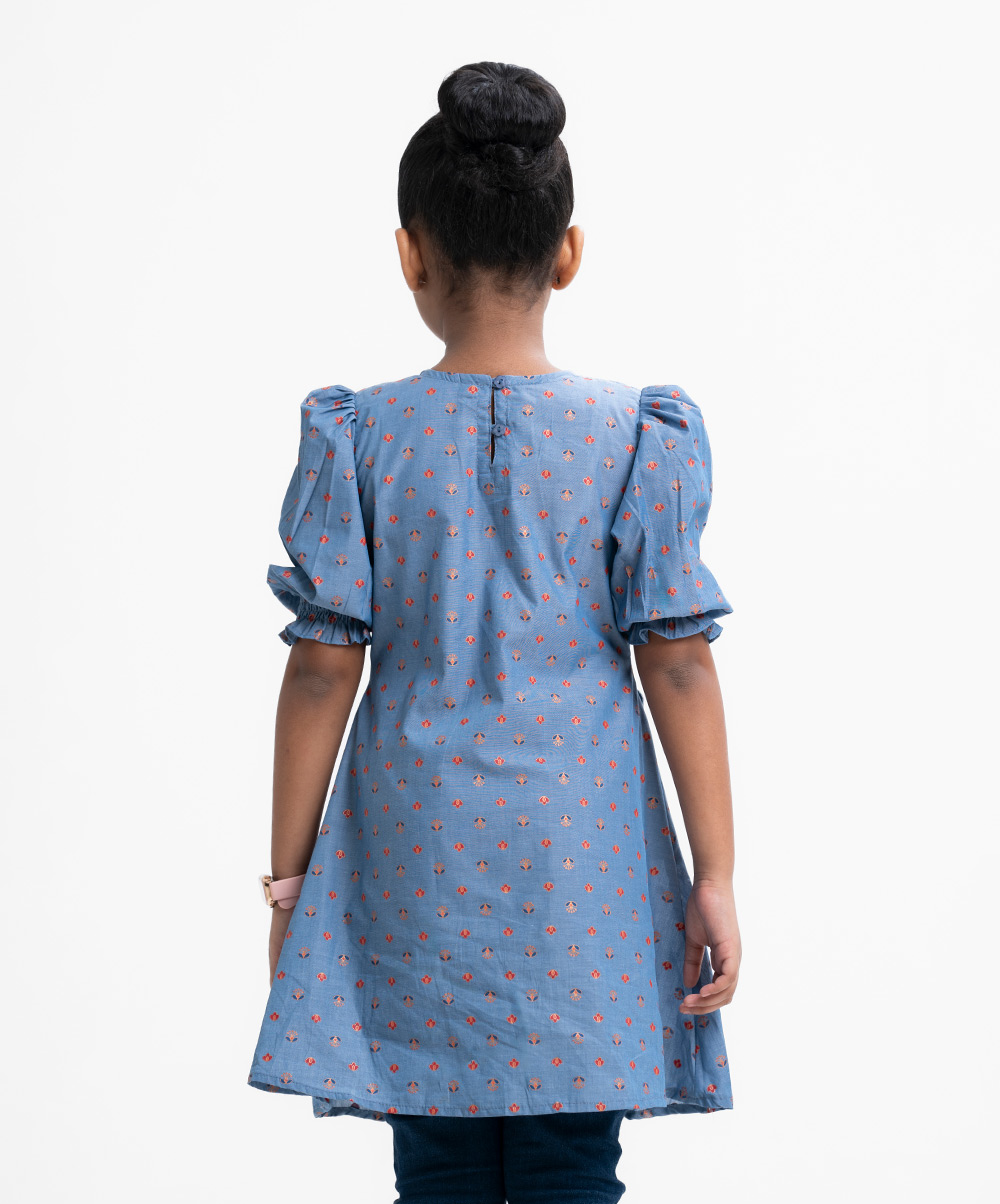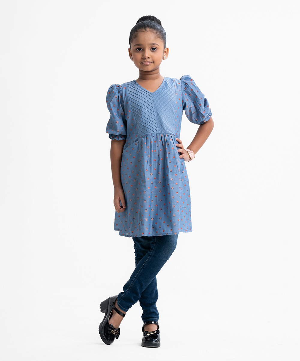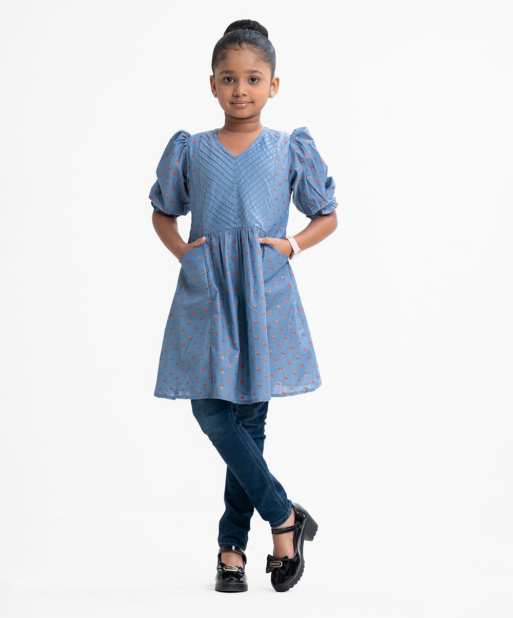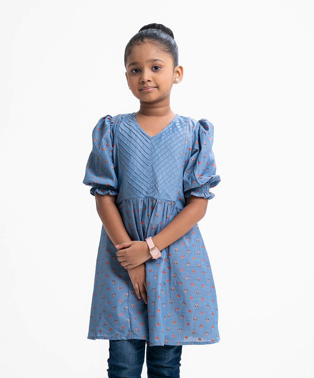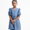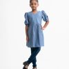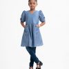 Kid girls A-line tunic in chambray fabric. V-neck, bishop sleeves. Pintuck at front and inseam pockets.