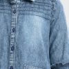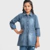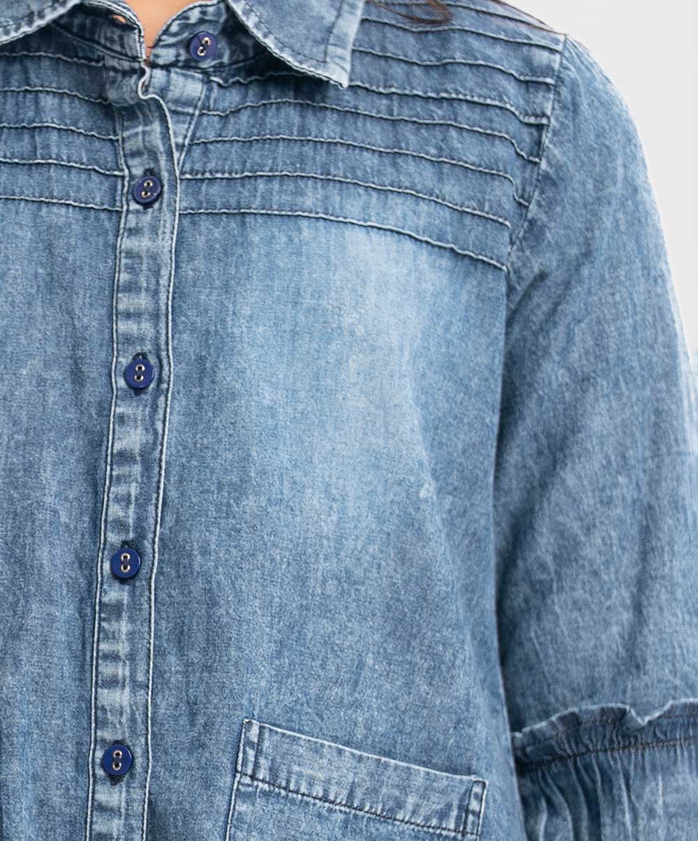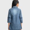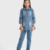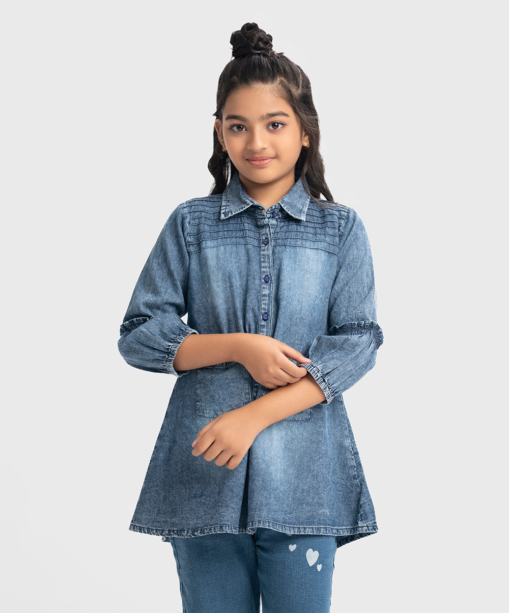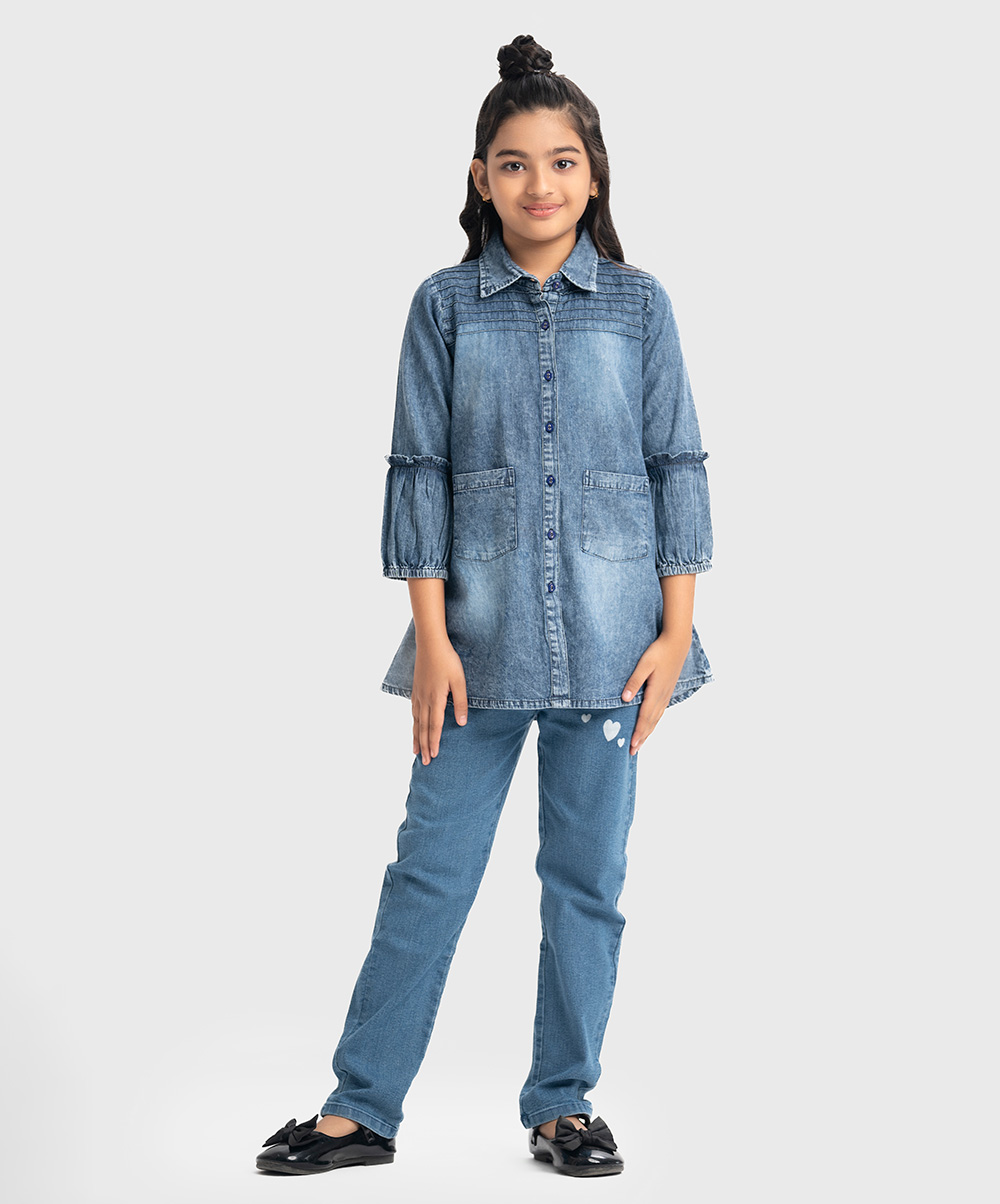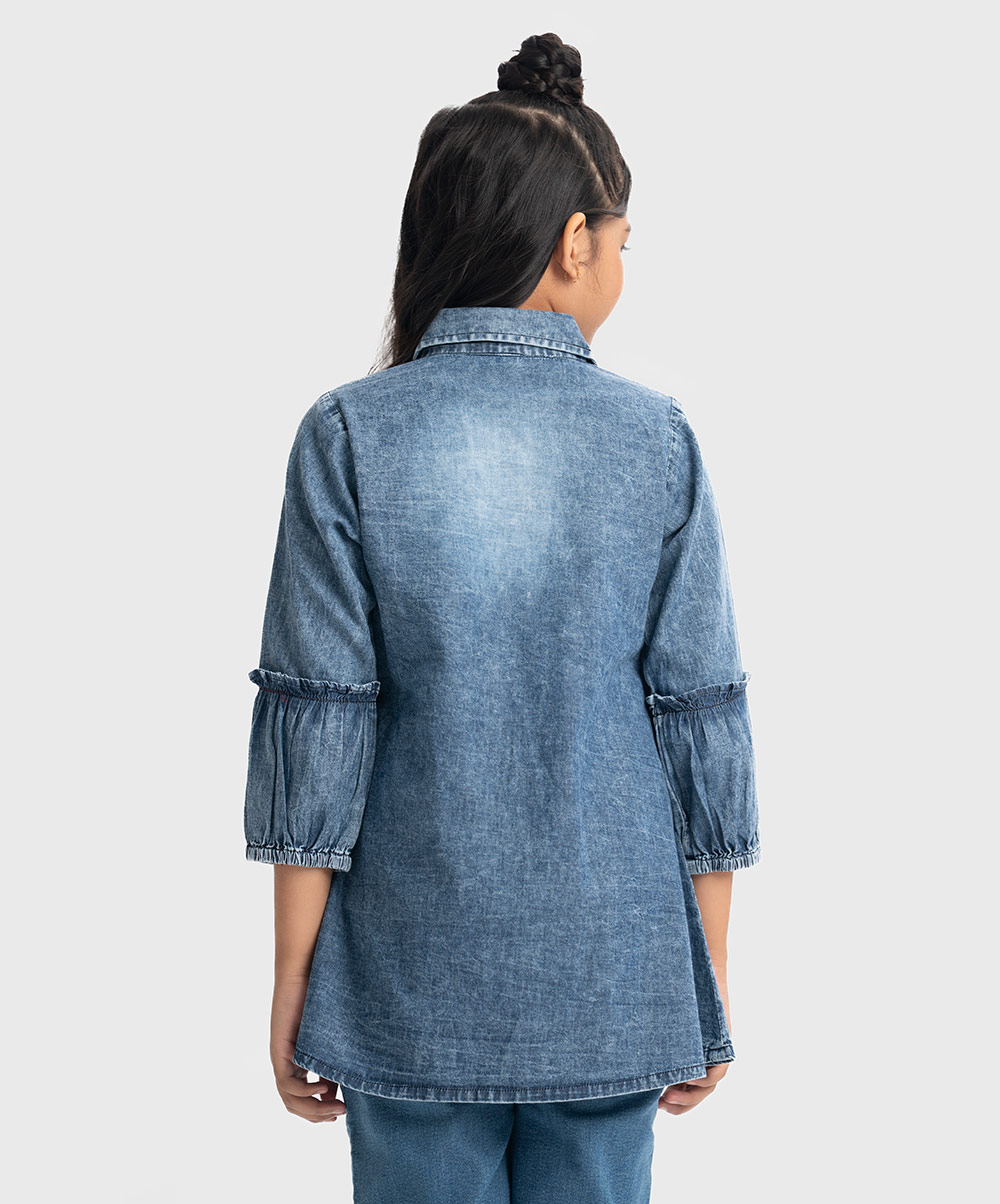 Kid girls A-line tunic in denim fabric. Classic collar, three-quarter sleeves. Buttons fastening & two front pockets.