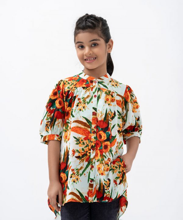 Kid girls tent-style short tunic in printed georgette fabric. Mandarin collar, puff sleeves. Button fastening at front.