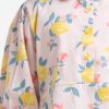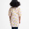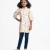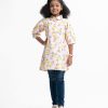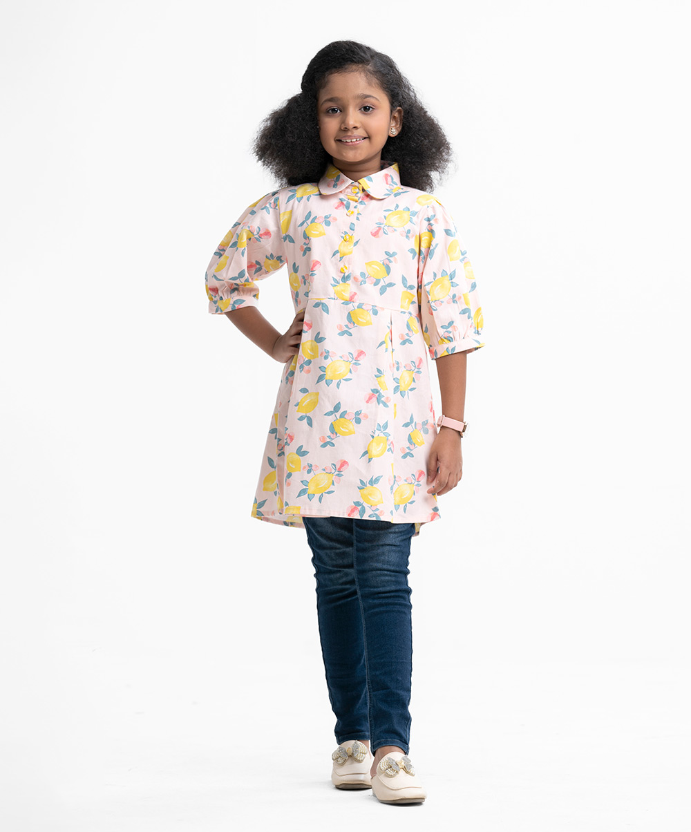 Kid girls A-line tunic in printed cotton fabric. Baby collar with buttons placket, puff sleeves. Pleated waistline.