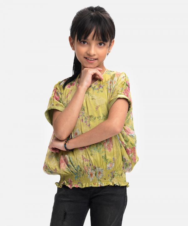 Kid girls tunic in printed Georgette fabric. Kimono sleeves, round neck and smoky waistline.