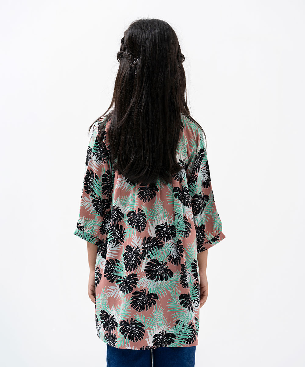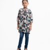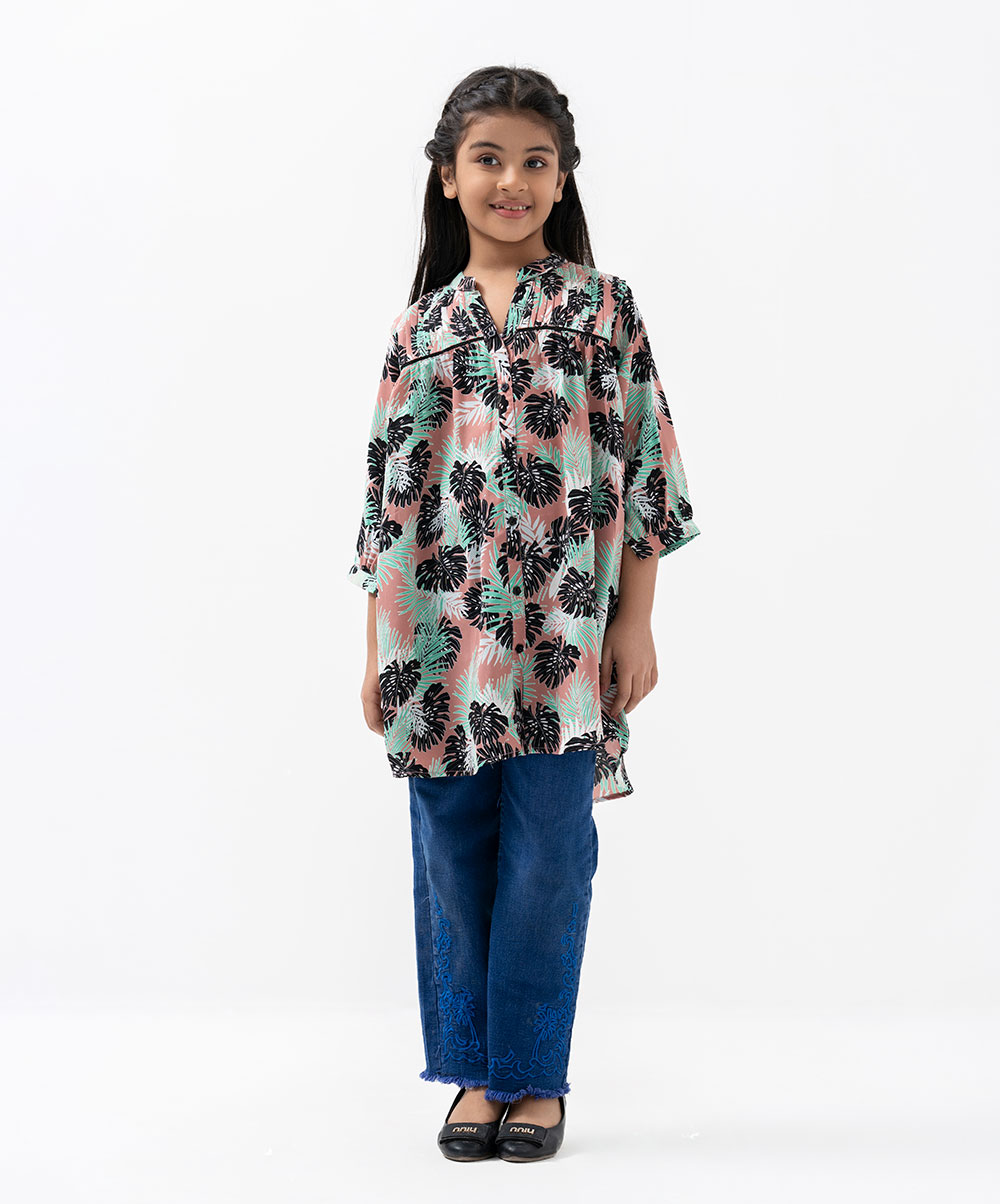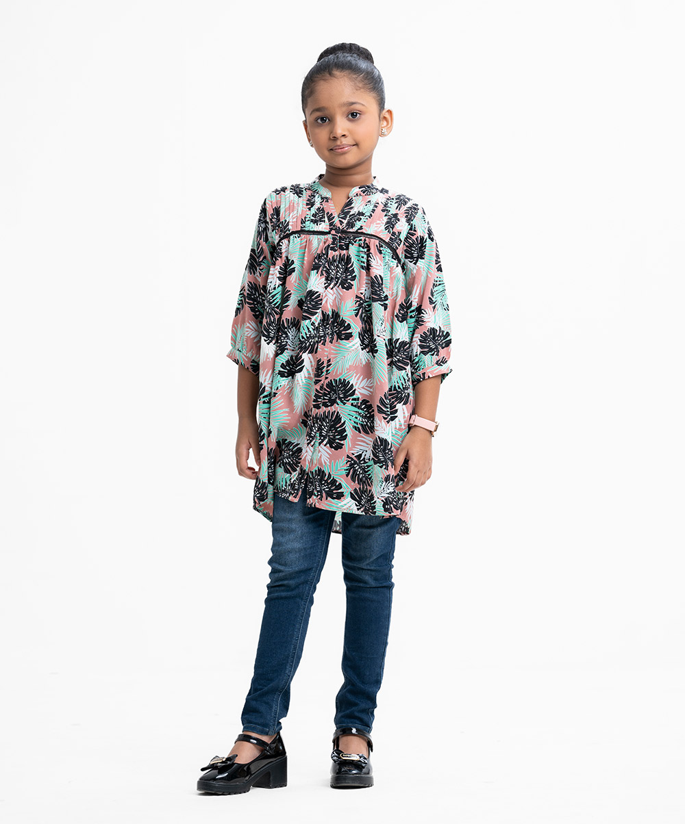 Kid girls tent-style tunic in printed georgette fabric. Mandarin collar, bishop sleeves. Decorative buttons, pintuck and lace at front.