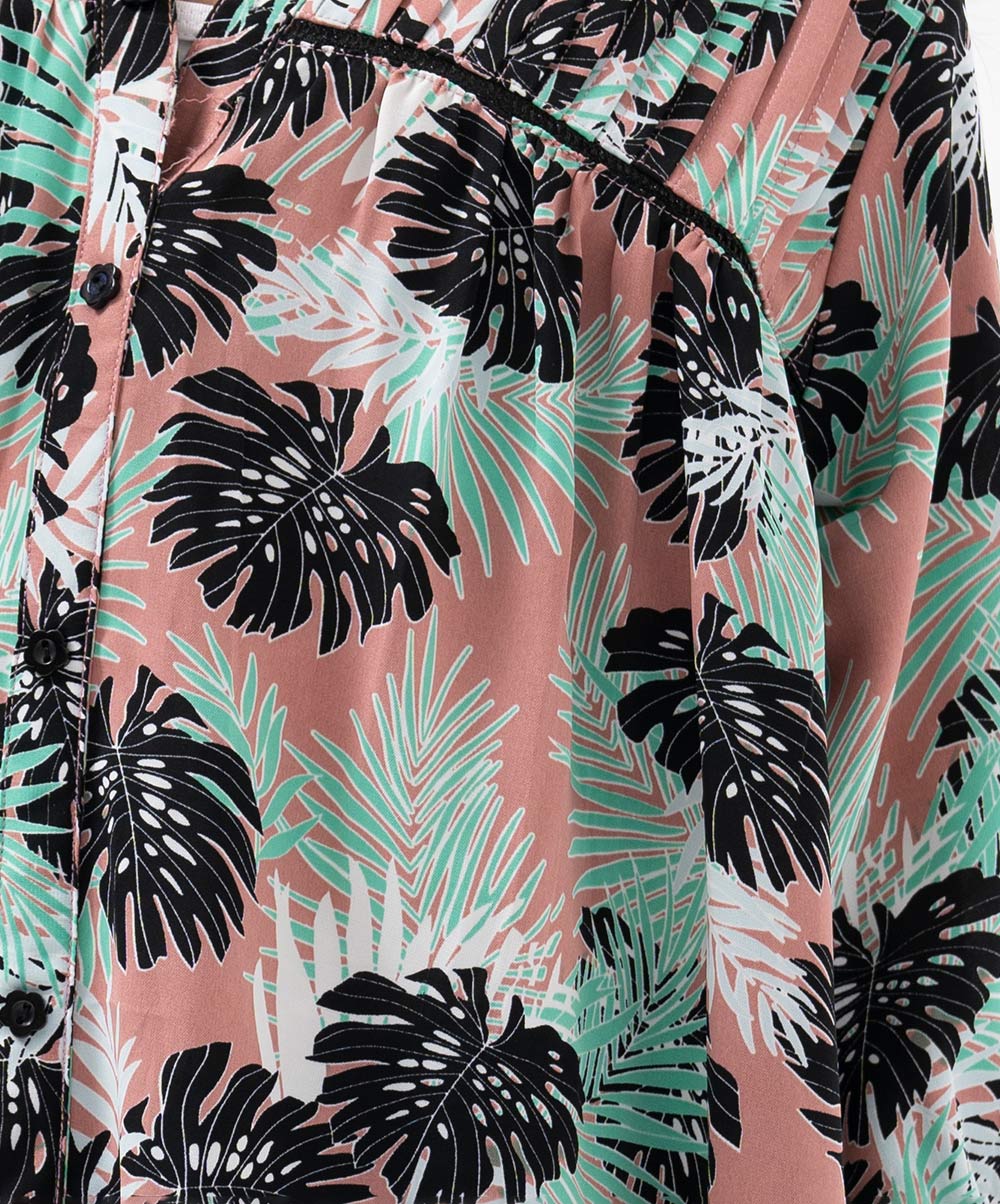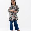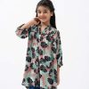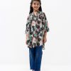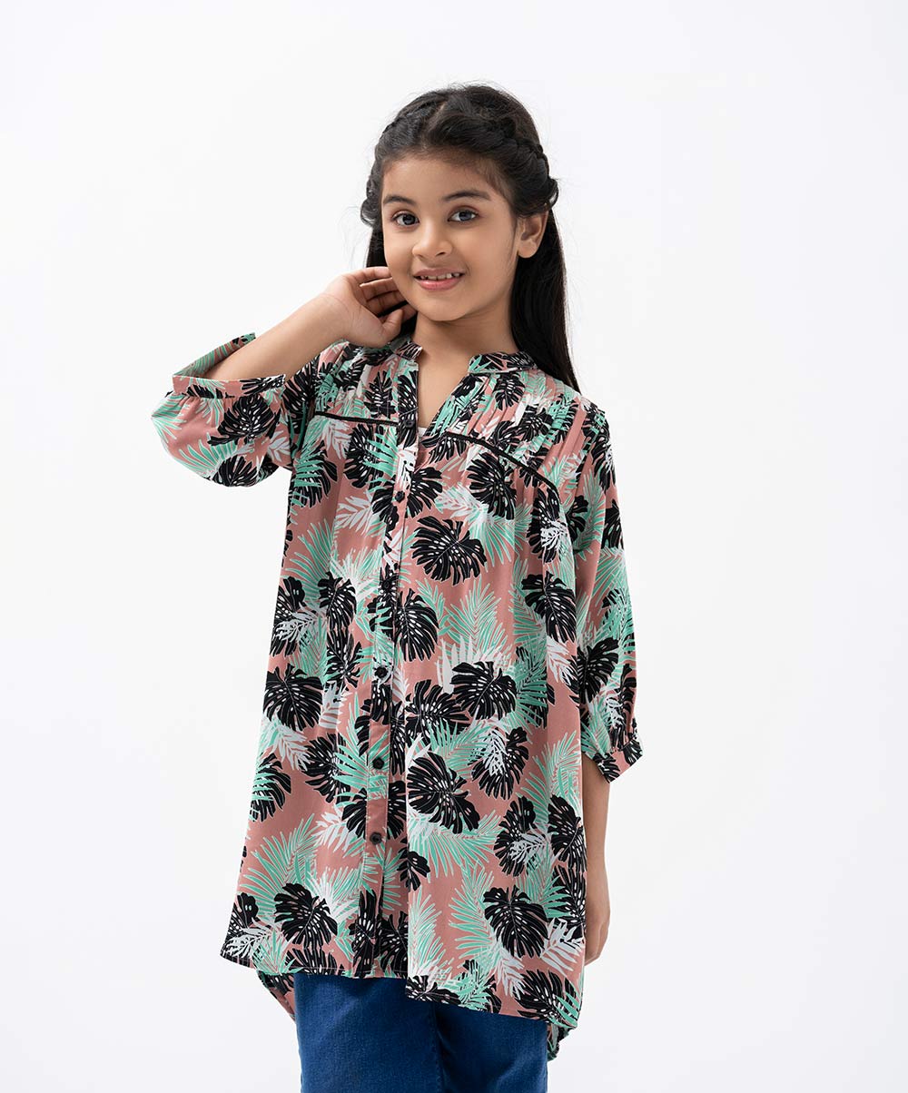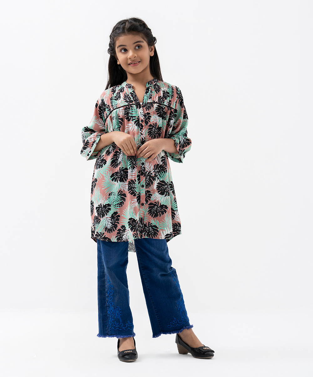 Kid girls tent-style tunic in printed georgette fabric. Mandarin collar, bishop sleeves. Decorative buttons, pintuck and lace at front.