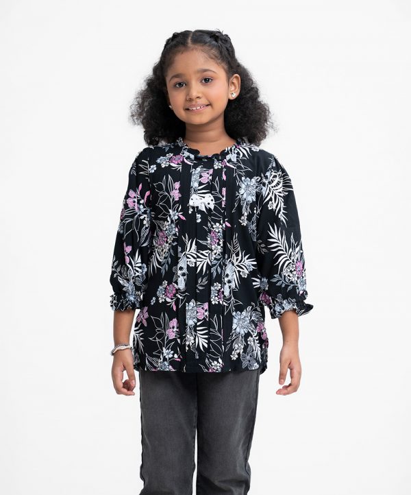 Women’s printed short tunic in viscose fabric.Round neck with frills, three-quarter sleeve and decorative patch at the front.
