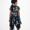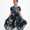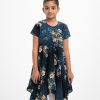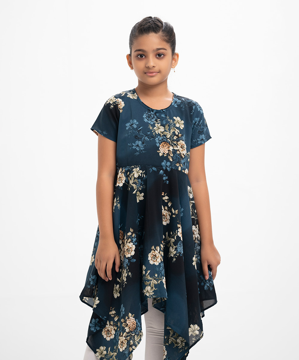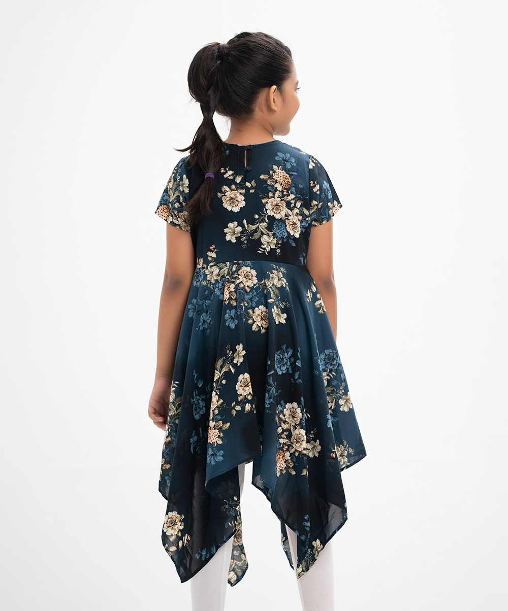 Cap-sleeved A-line frock in georgette fabric. Round neck with elongated hemline.