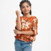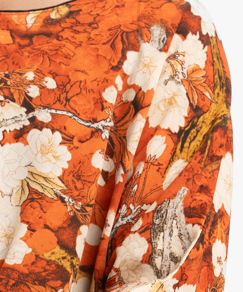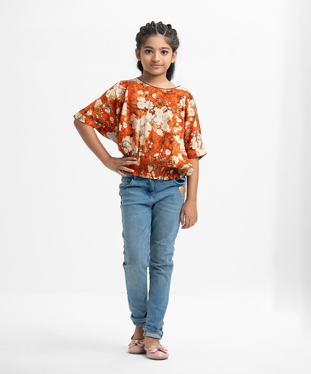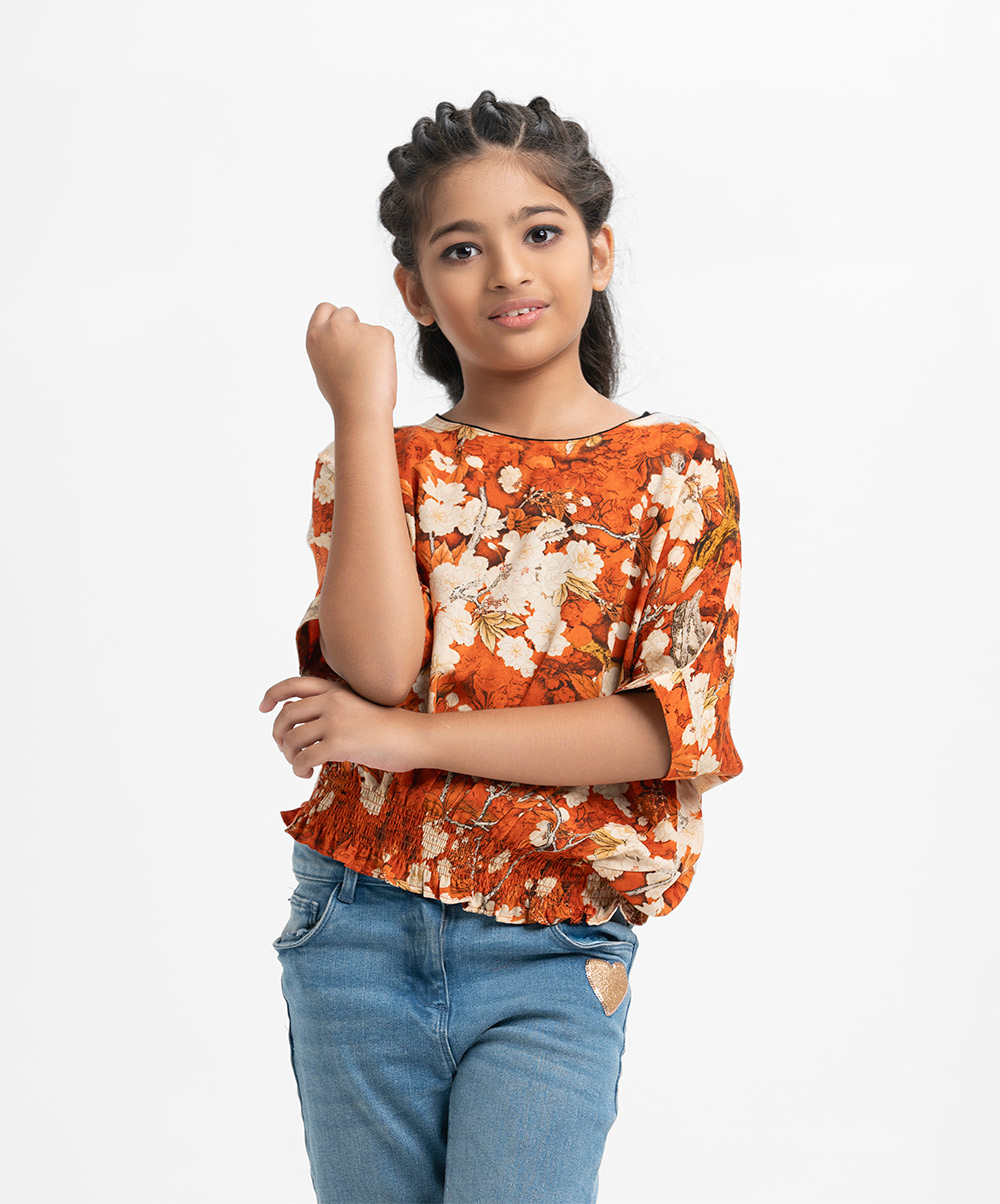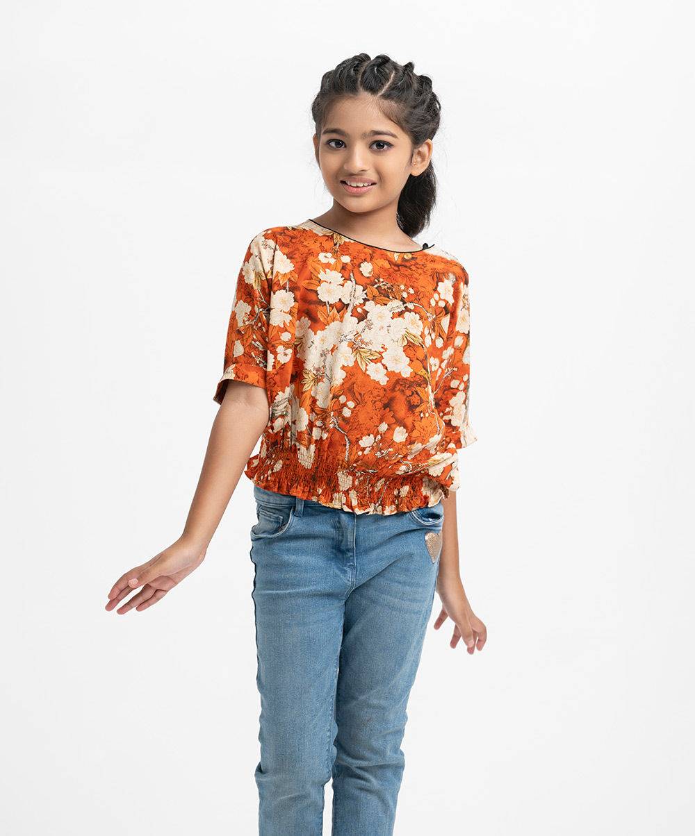 Kid girls short tunic in printed georgette fabric. Round neck, batwing sleeves. Elastic smocked detail at waistline.