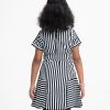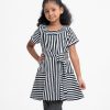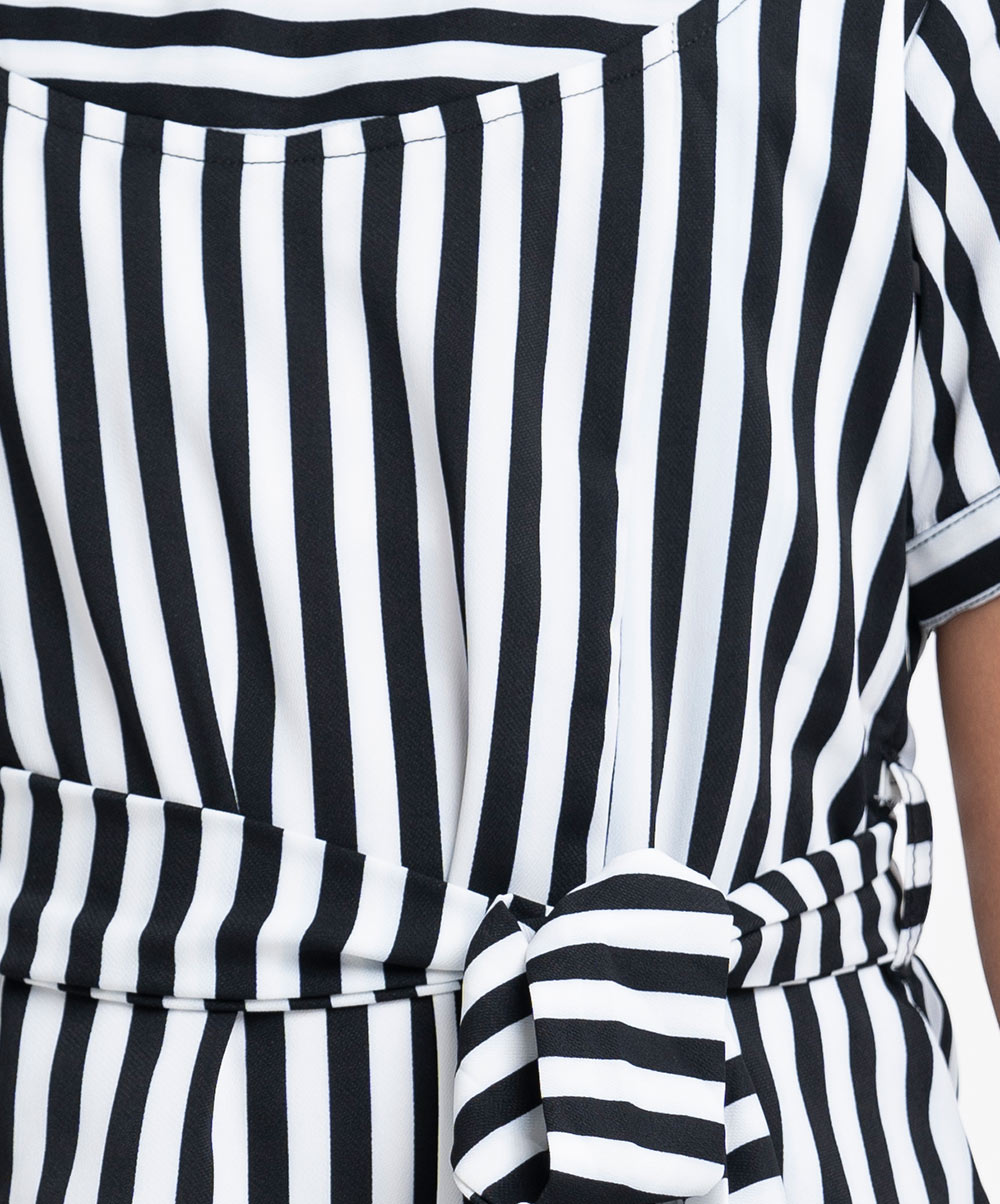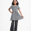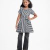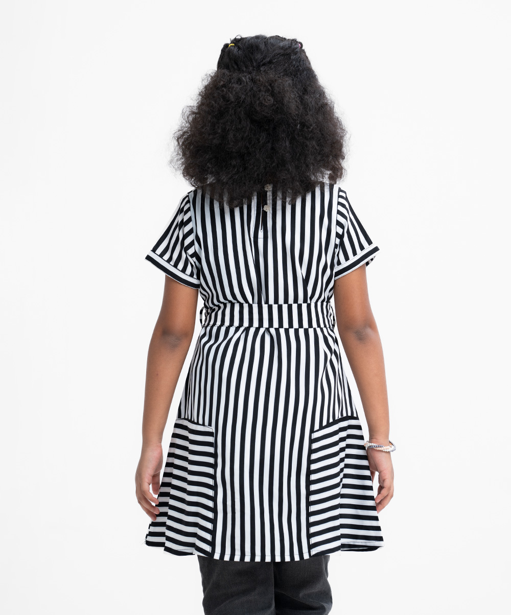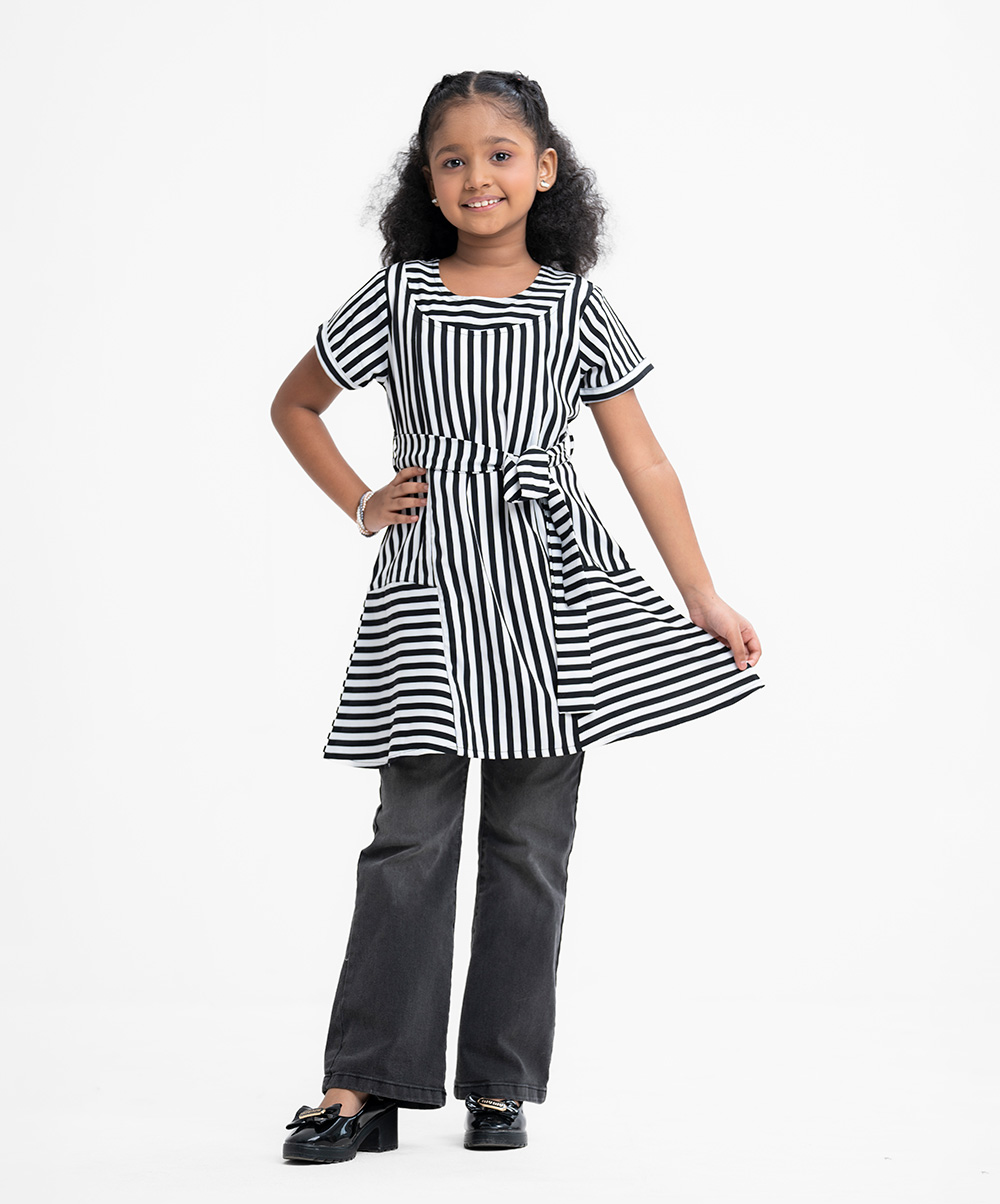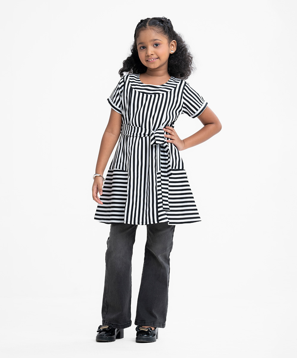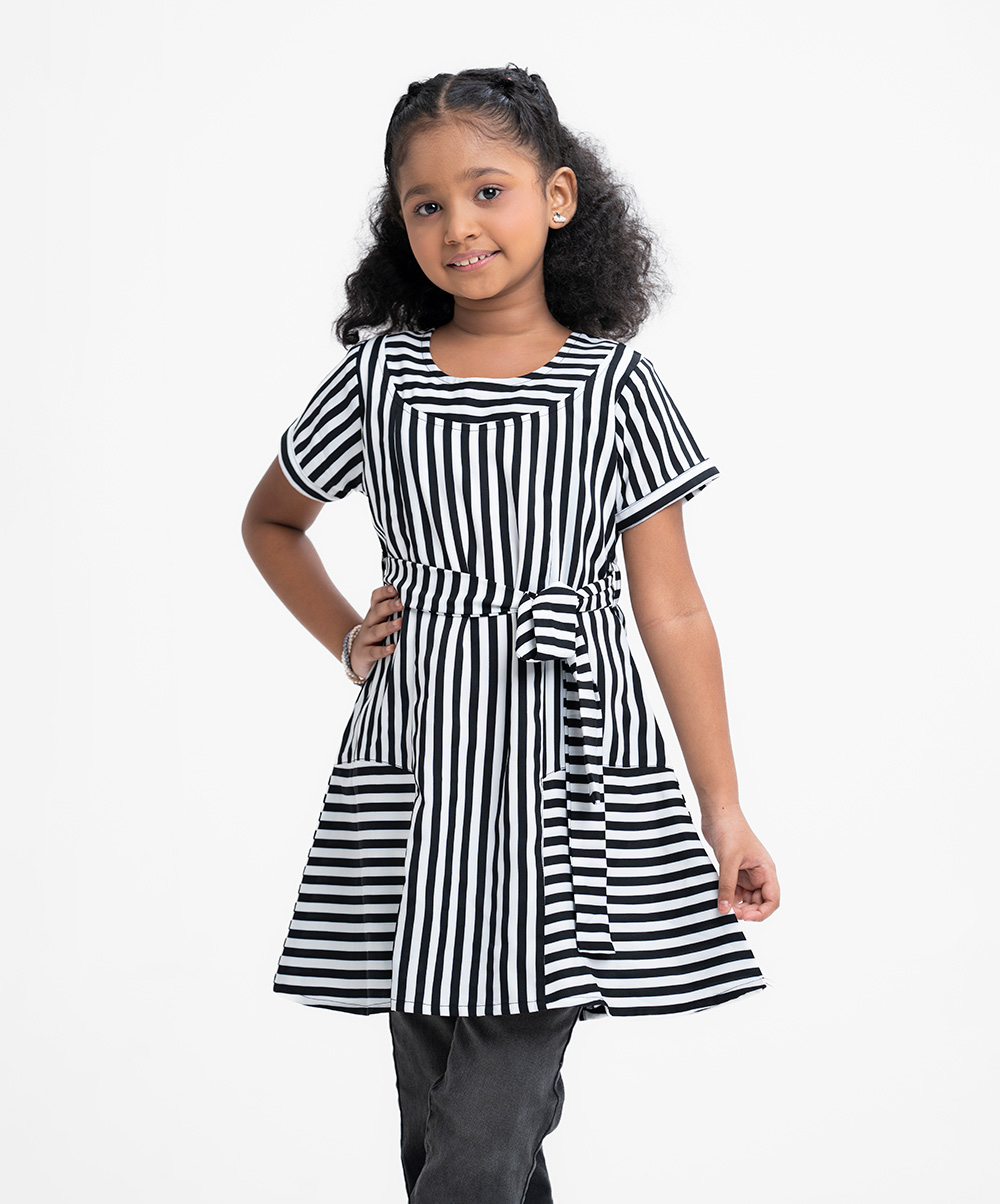 Kid girls A-line tunic in stripe printed georgette fabric with cotton lining. Round neck, cap sleeves. Attached belt cord at the waistline.