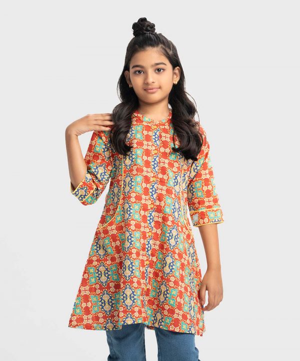printed A-line tunic in cotton fabric. Three-quarter sleeves, patterned pocket at the front.