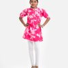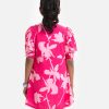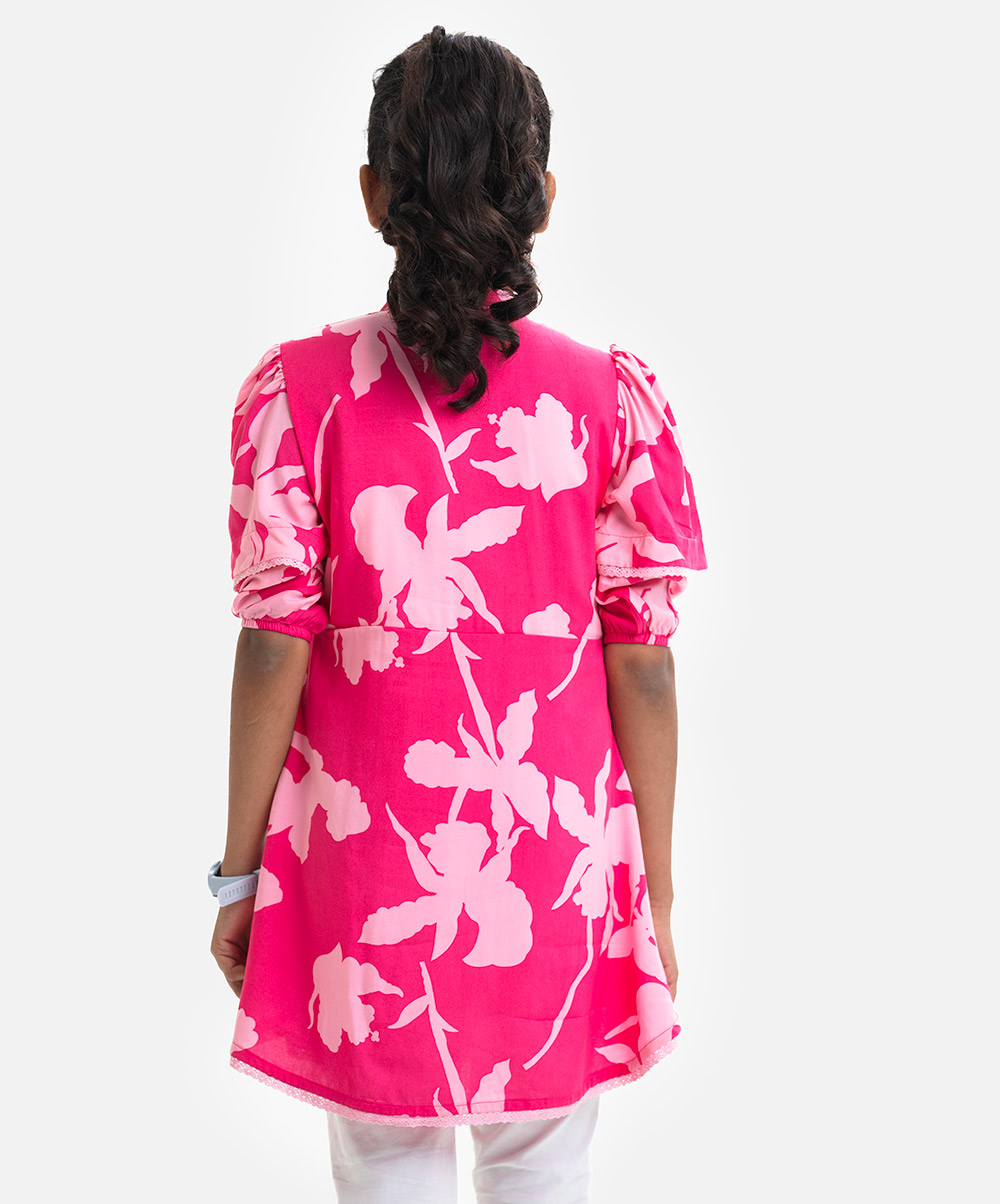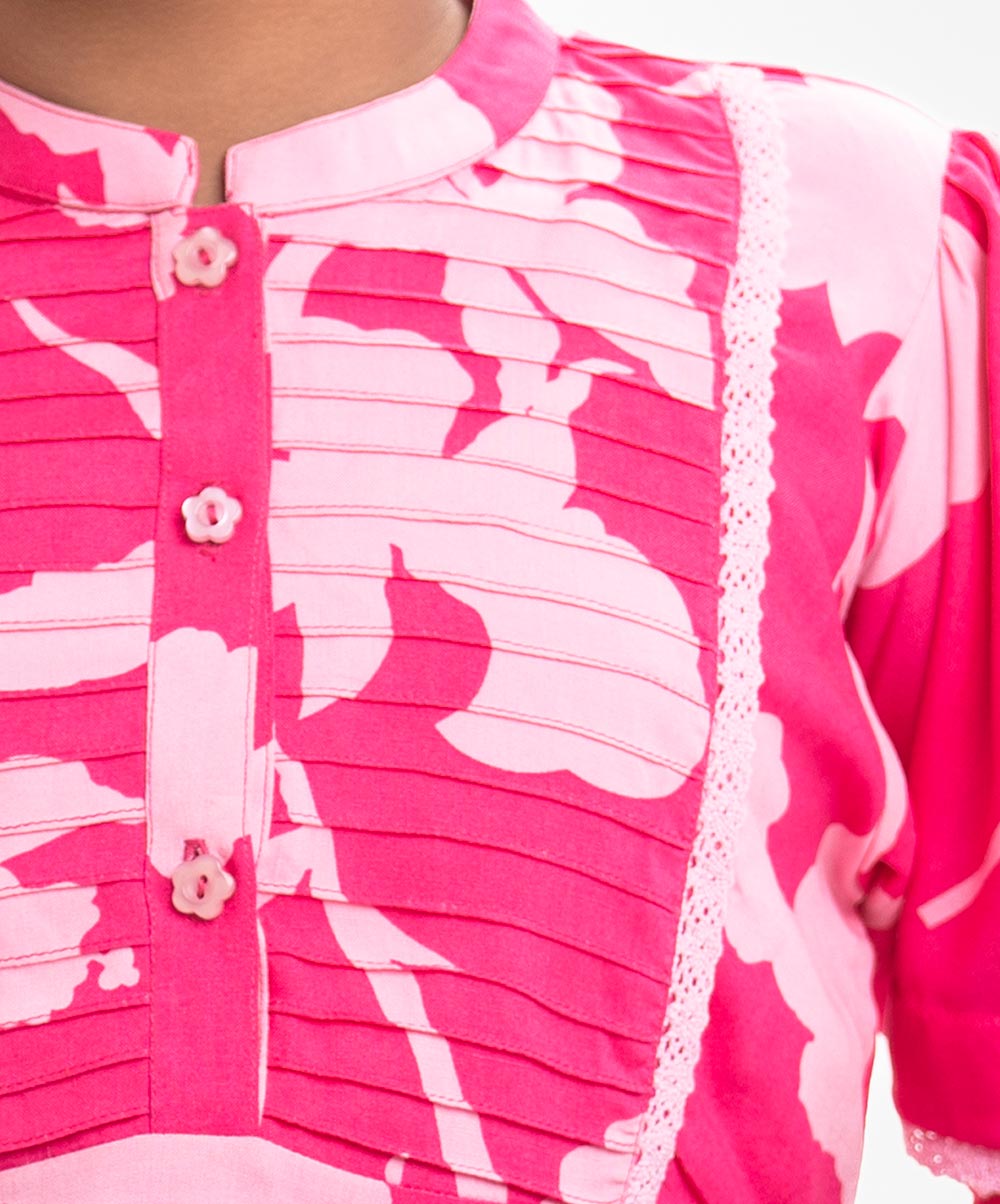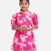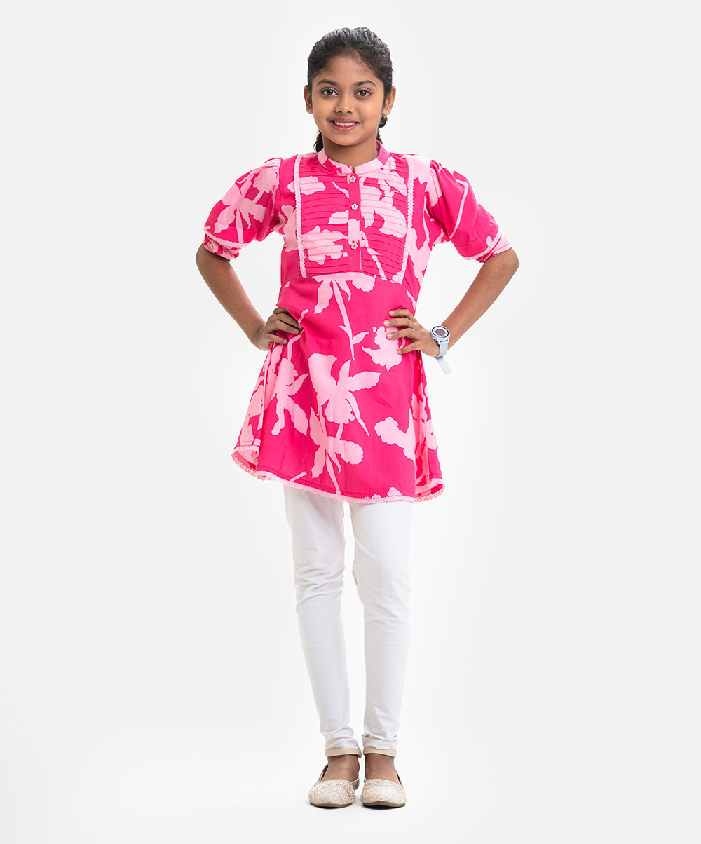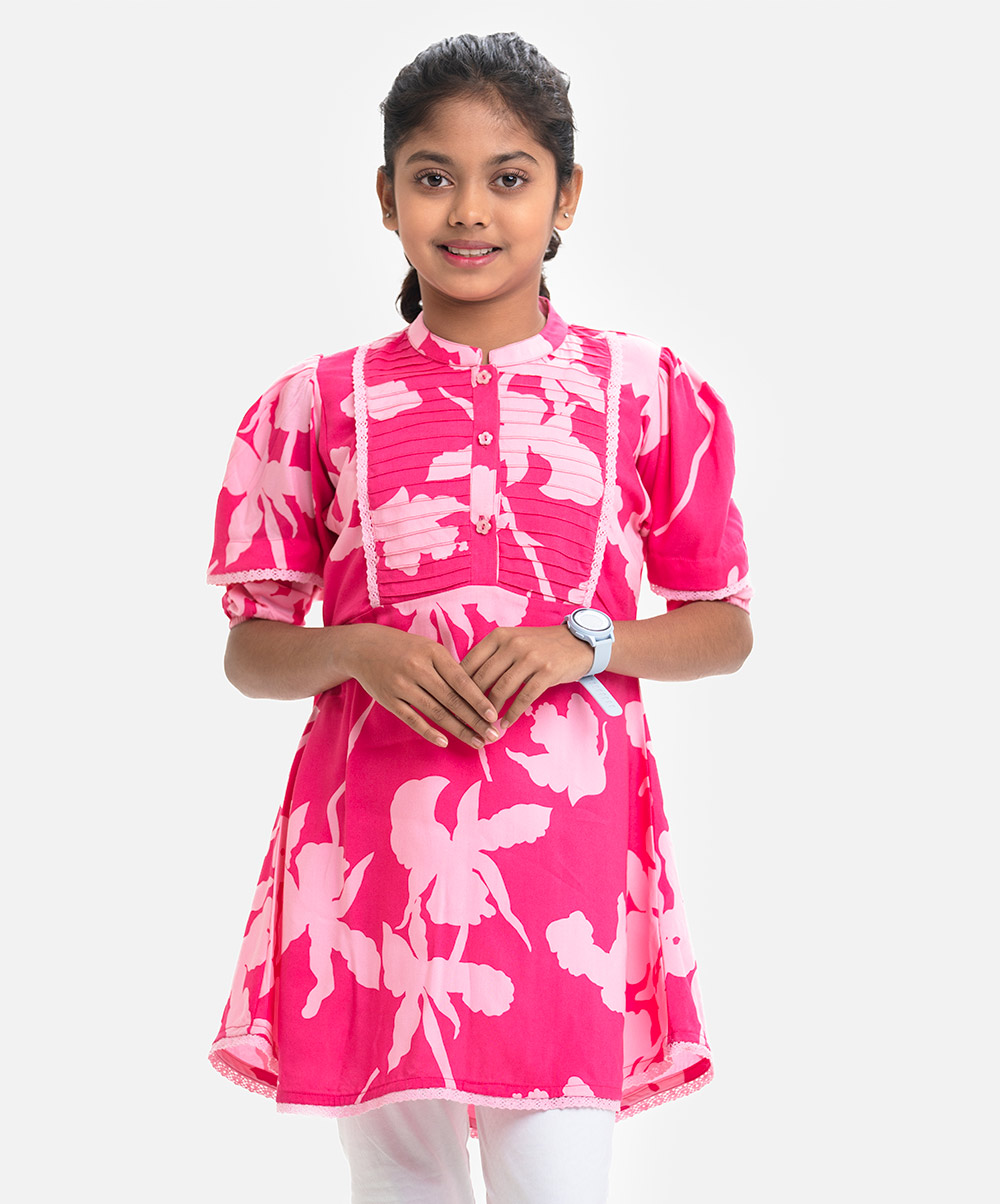 Band collar tunic in viscose sleeves. Puff sleeves, pintuck details.