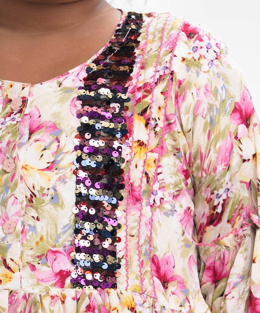 Round neck A-line georgette frock wth lantern sleeves and sequined mesh patches.