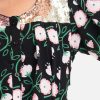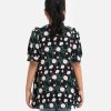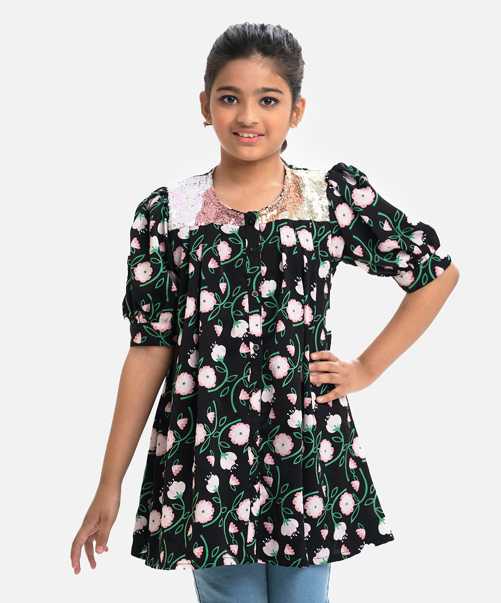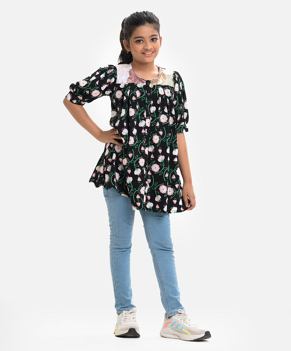 Round neck empire-style tunic in soft viscose fabric. Puff sleeves, sequined patch on the shoulders.