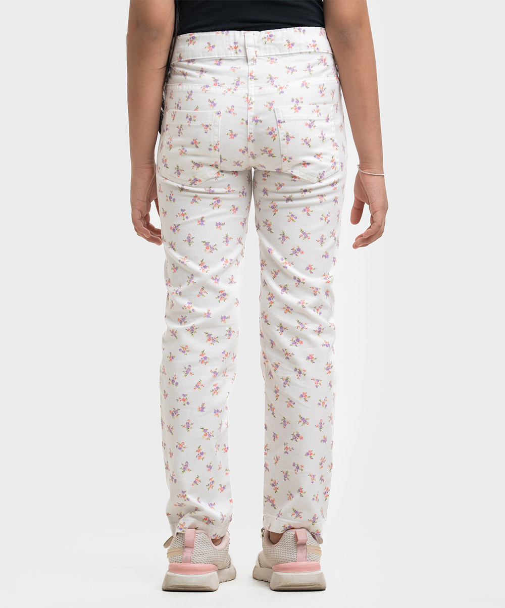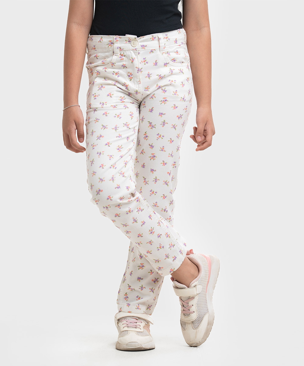 Kid girls’ floral printed woven long pants in twill fabric. Classic four-pocket styling with a zip fly.