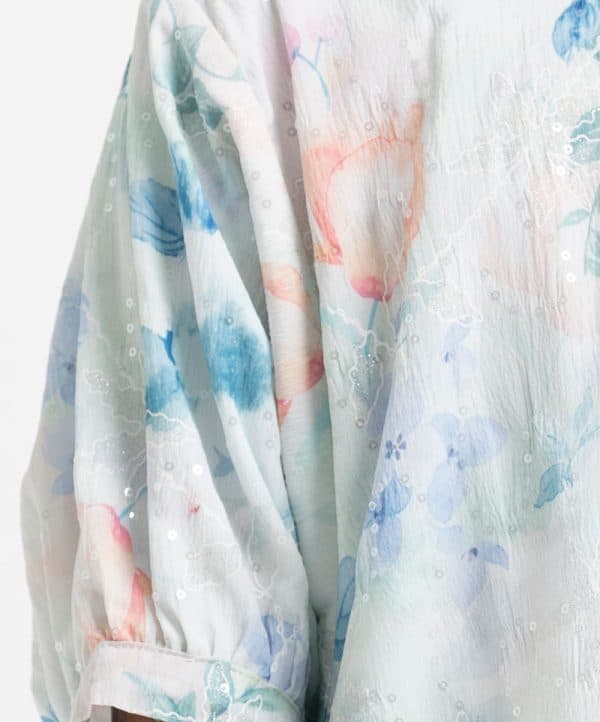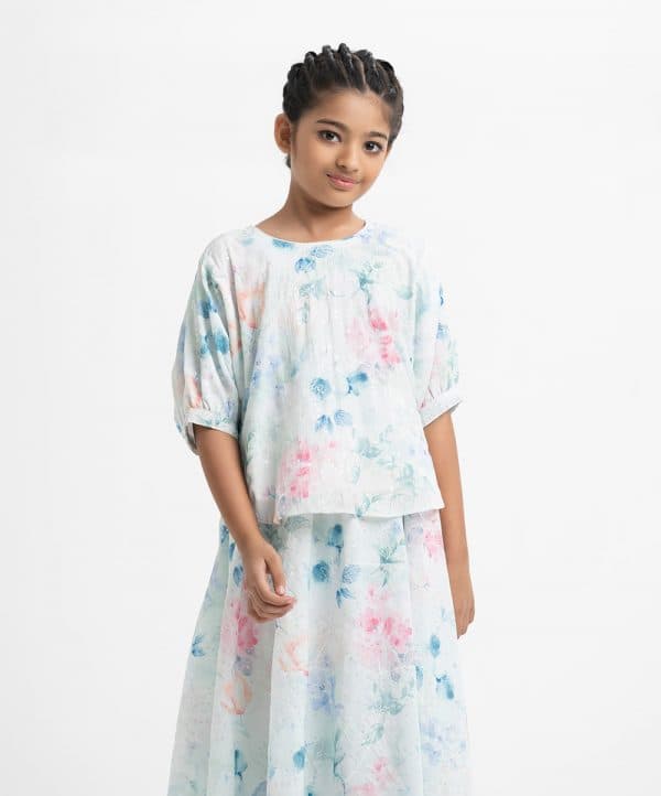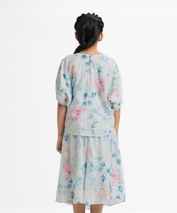 Kid girls’ floral printed woven set in georgette fabric with cotton lining. Bat-wing sleeves, round neck, and all over sequin details on the top.Comes with a matching skirt at the bottom.