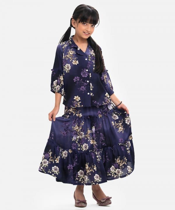 Lapel collar shirt with lantern sleeves in georgette fabric. Complemented with a tiered patterned skirt.