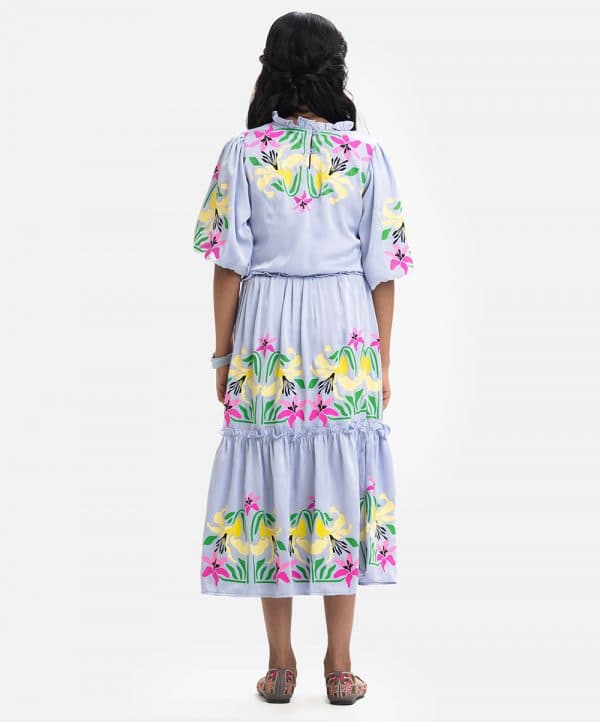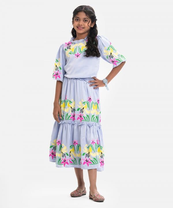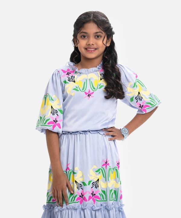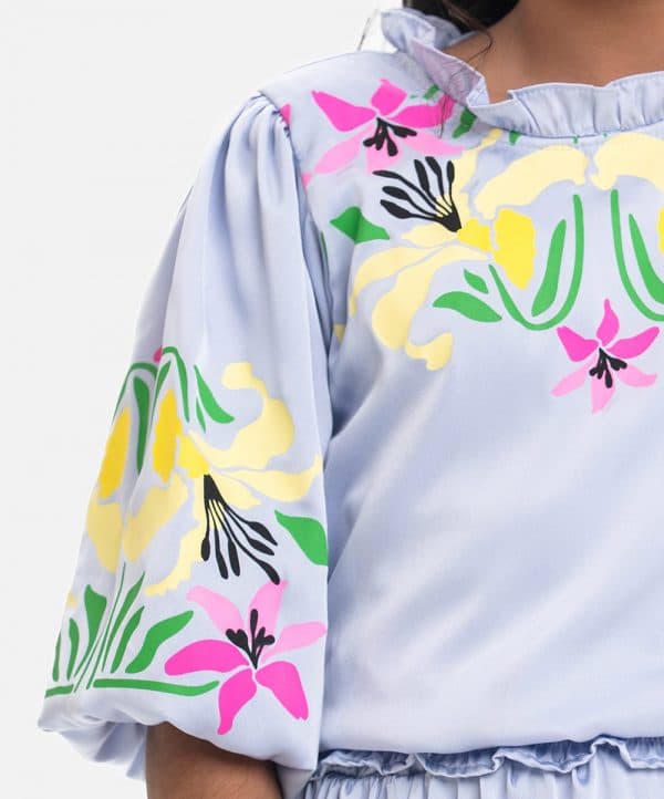 Frilled round neck woven top with balloon puff sleeves and smocked waist in satin-georgette fabric. Paired with an elasticated waist skirt.
