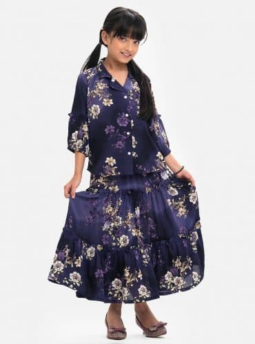 Frilled round neck woven top with balloon puff sleeves and smocked waist in satin-georgette fabric. Paired with an elasticated waist skirt.