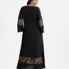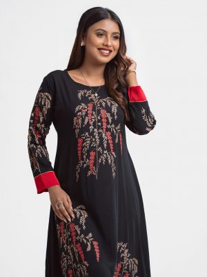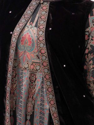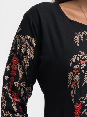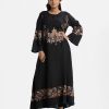Women’s abaya-style gown in crepe fabric. Round neck with metal button placket, bell sleeves. Print detail at front, sleeves and hem. Two inseam side pockets.
