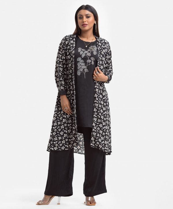 Women’s abaya style top bottom set in printed georgette fabric shrug, joom fabric top & bottom. Lapel collar with single button front opening, karchupi detail at tops front. Palazzo pants as the bottom.