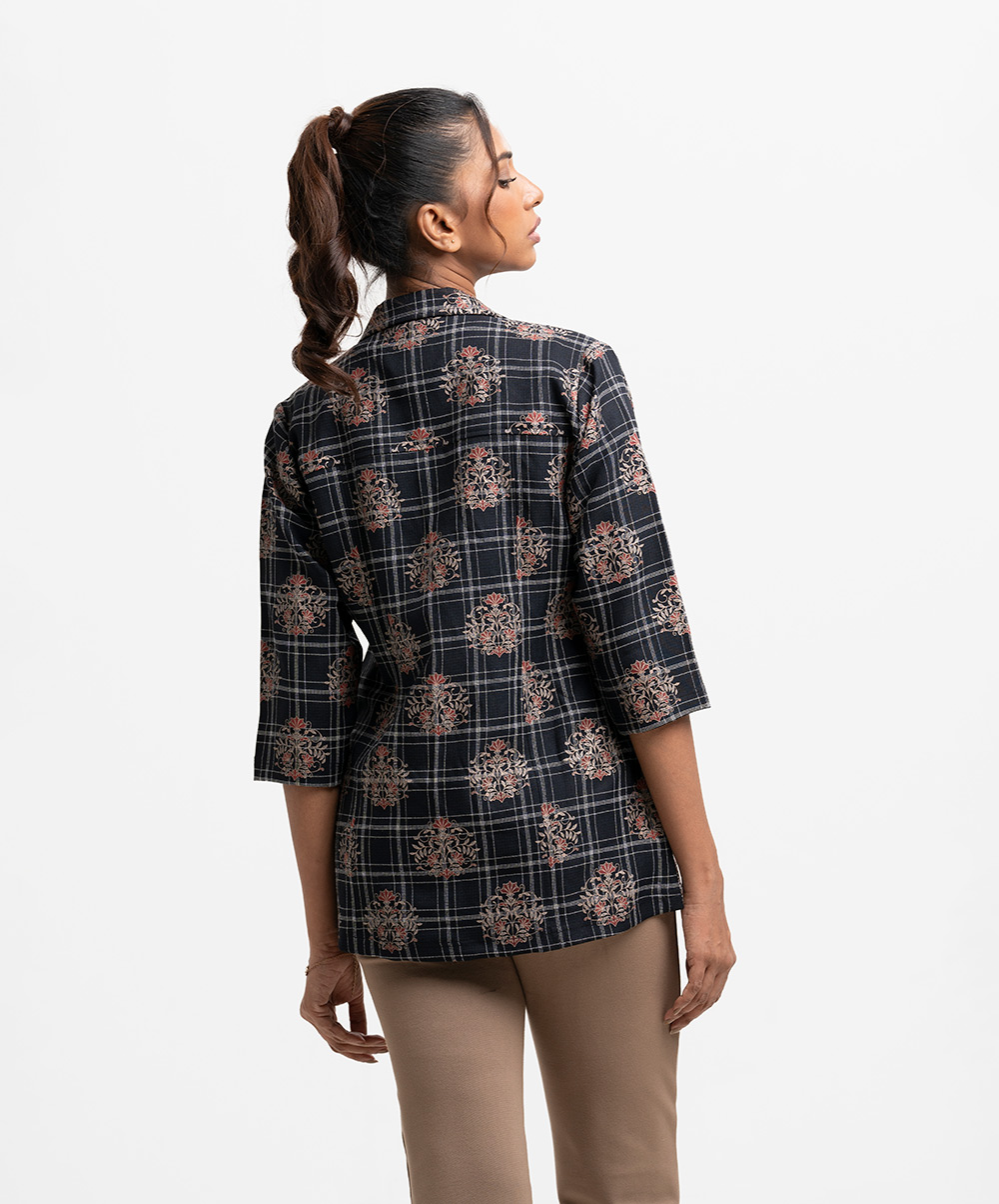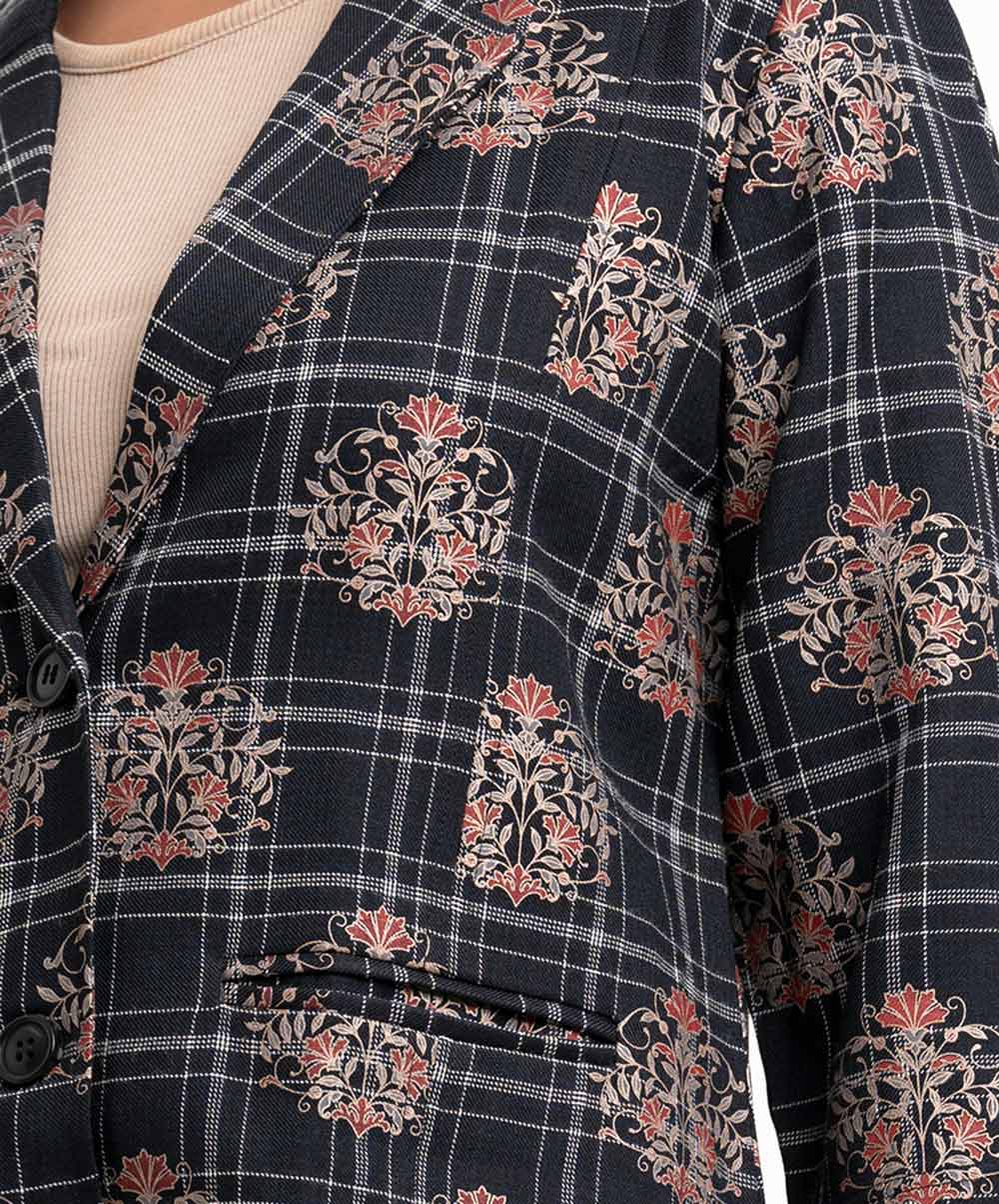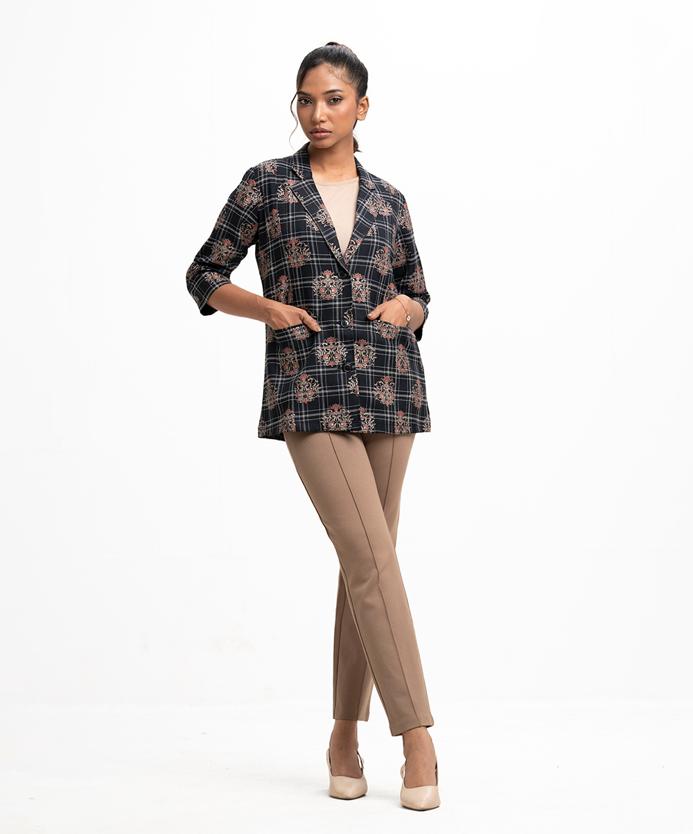 Women’s printed blazer in flannel check fabric. Lapel collar, long sleeves, button fastening at the front. Two jetted pockets.