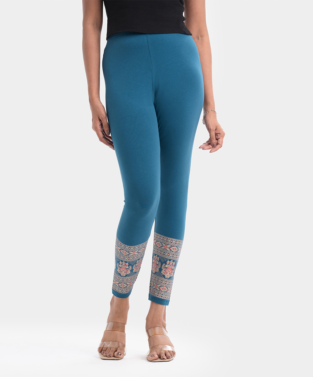 Stretchable cotton knit leggings with a clean elasticated waistline and print on the cuffs.