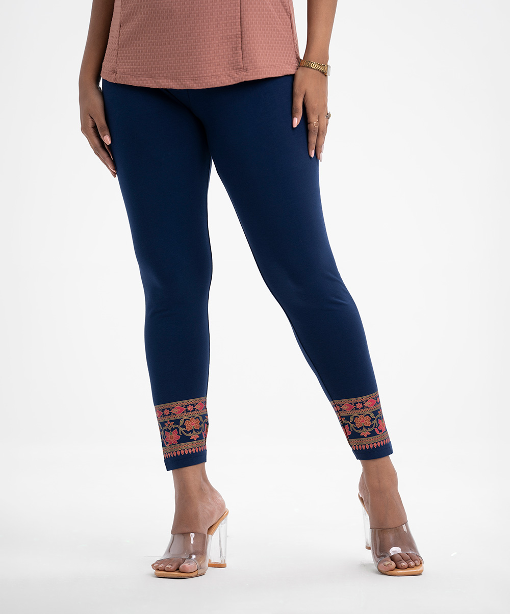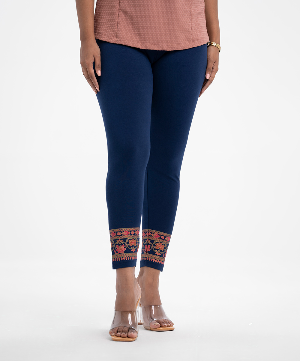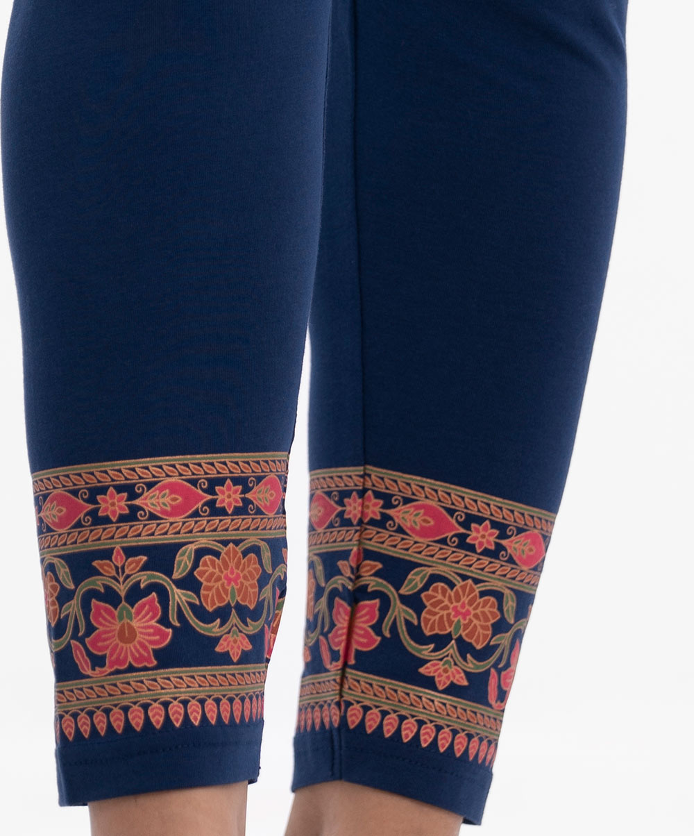Women’s leggings in stretchable cotton knit fabric. Concealed elasticated waistline and print detail at cuff.