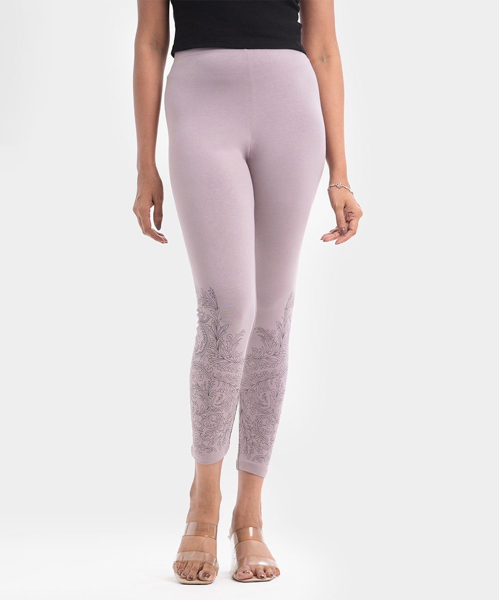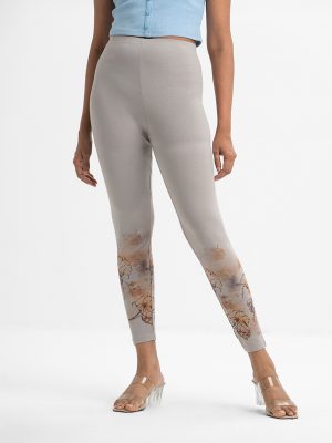 Women’s leggings in stretchable cotton knit fabric. Concealed elasticated waistline and print detail at cuff.