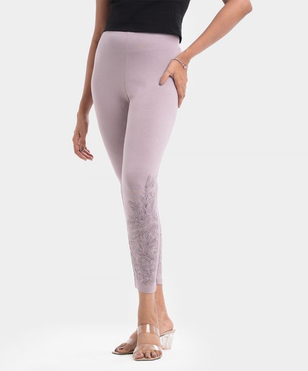 Women’s leggings in stretchable cotton knit fabric. Concealed elasticated waistline and print detail at cuff.
