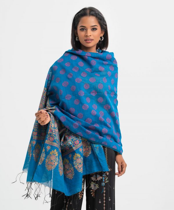 Women’s printed dupatta in half silk fabric. Fringe trim at the border.