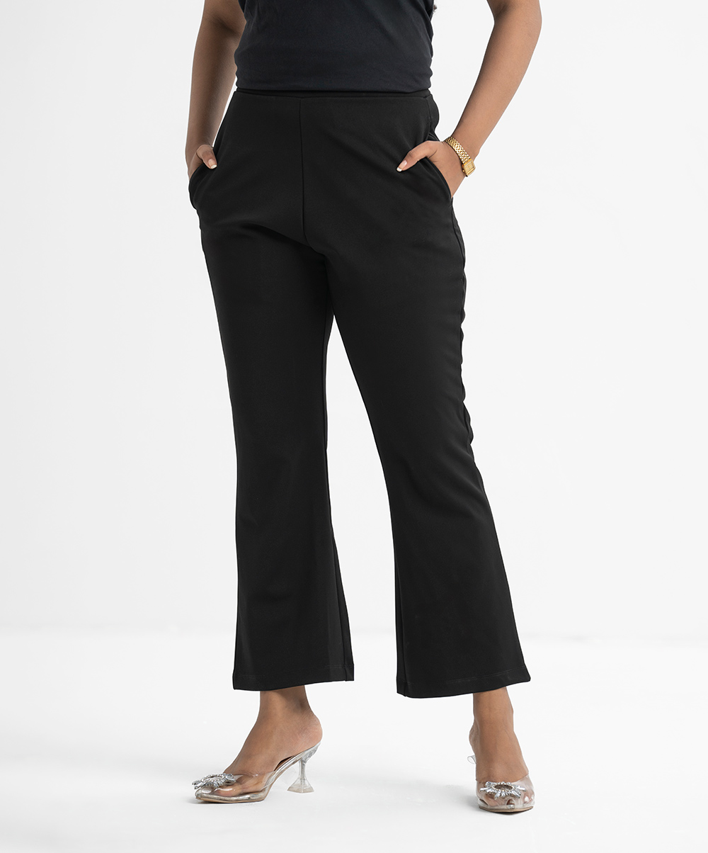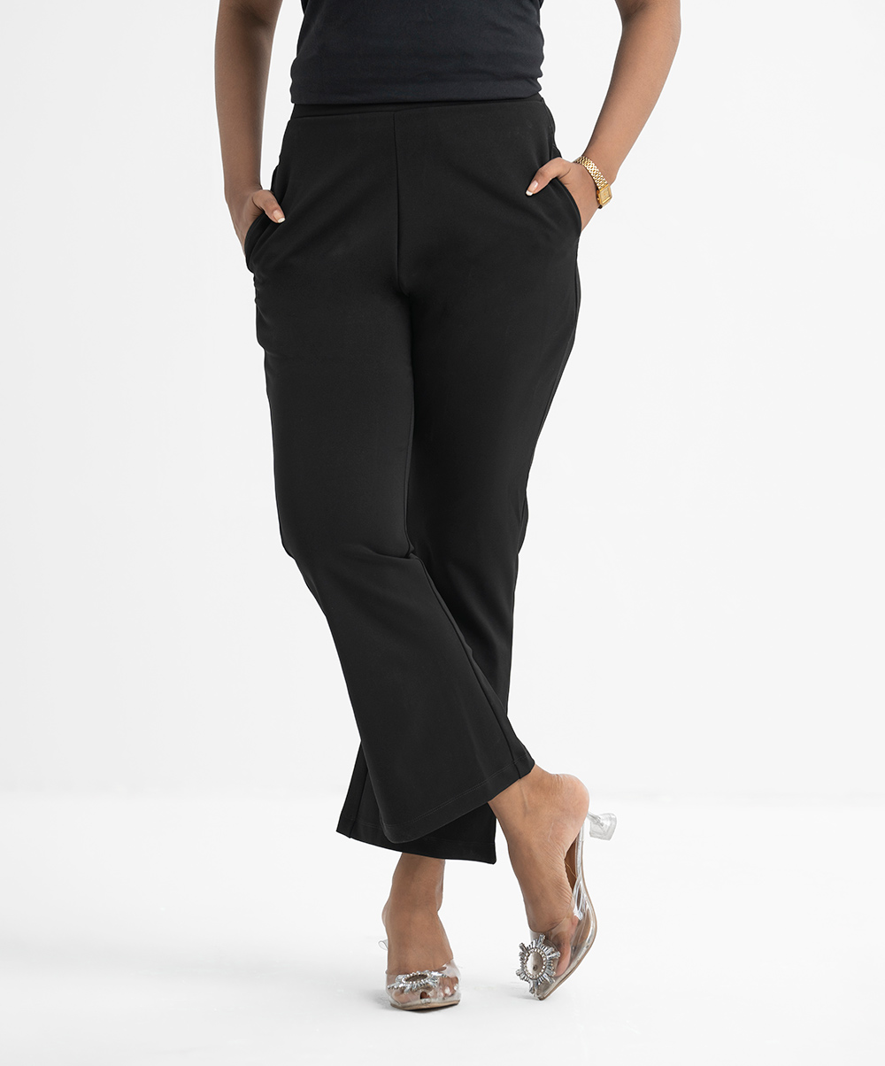 Women’s formal pants in stretched Interlock knit fabric. Front zipper fly and two side pockets.
