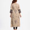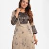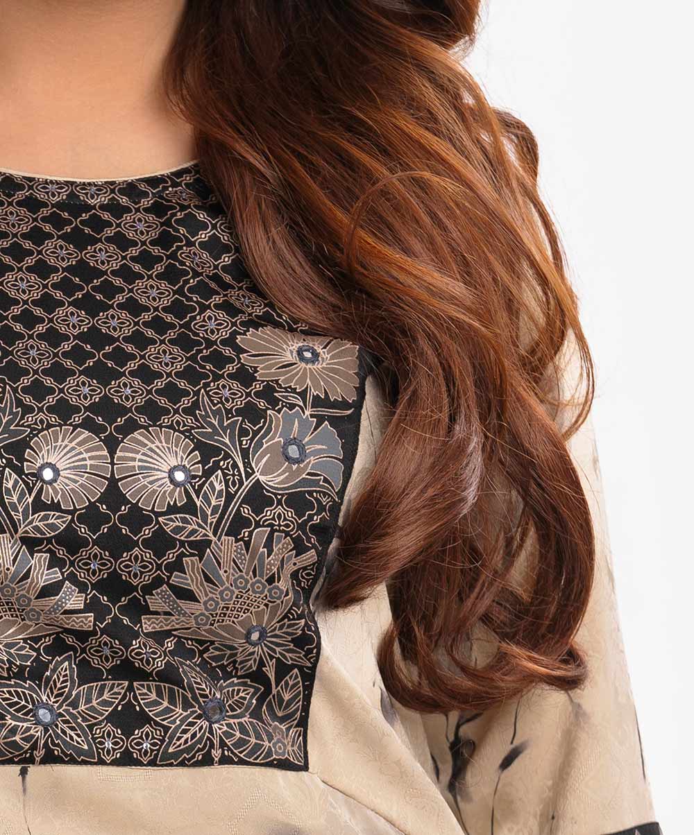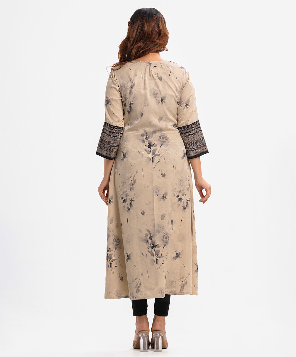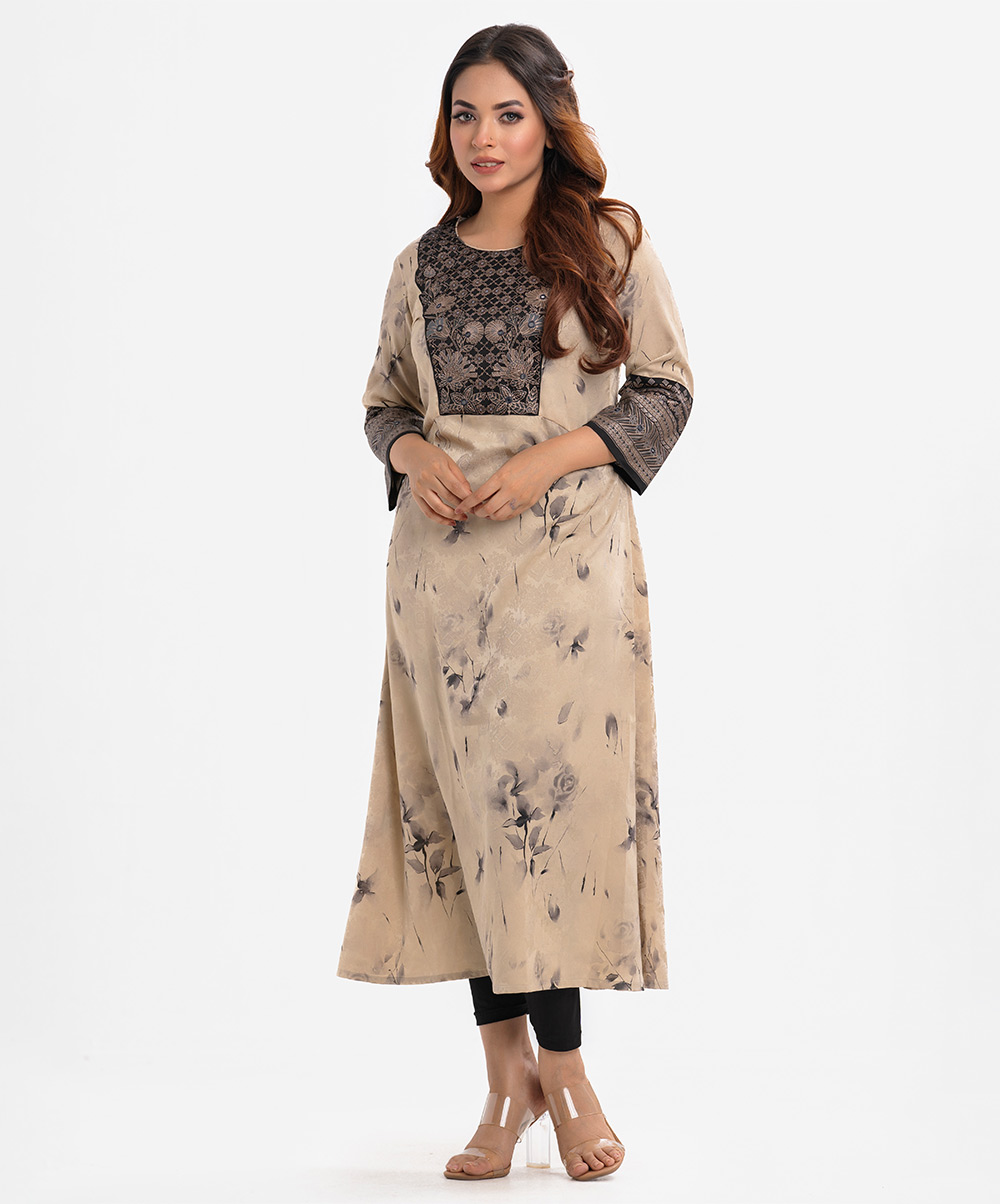 Women’s A-line gown in jacquard fabric. Round neck and three quarter sleeved with attached patch and karchupi at the front.
