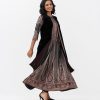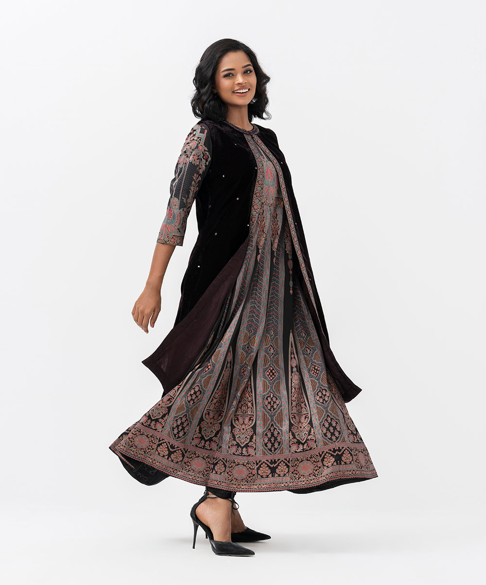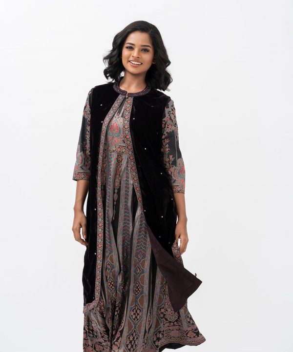Women’s long flared gown in crepe fabric from the Nargisus by Le Reve. Round neck, three-quarter sleeves. Complemented with a karchupi detailed velvet shrug.