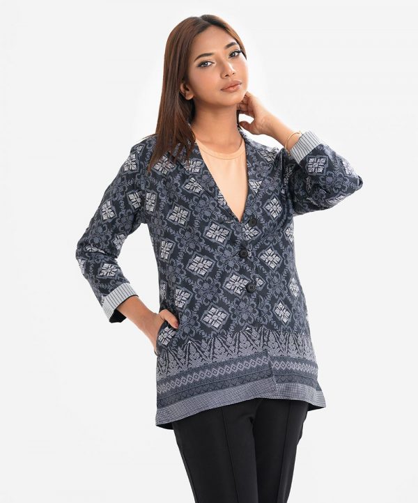 Women’s winter printed Jacket in taffeta fabric. Lapel collar, full sleeves. Front buttons opening. Inseam side pockets.