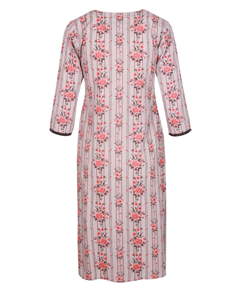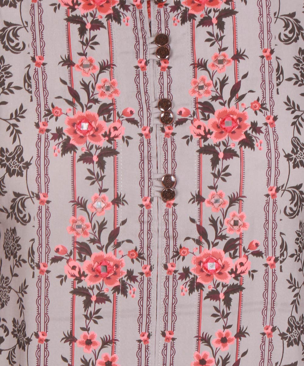 Grey viscose straight kameez with allover floral print. Embellished with front mirror embroidery, front buttons and sequin border on sleeves.