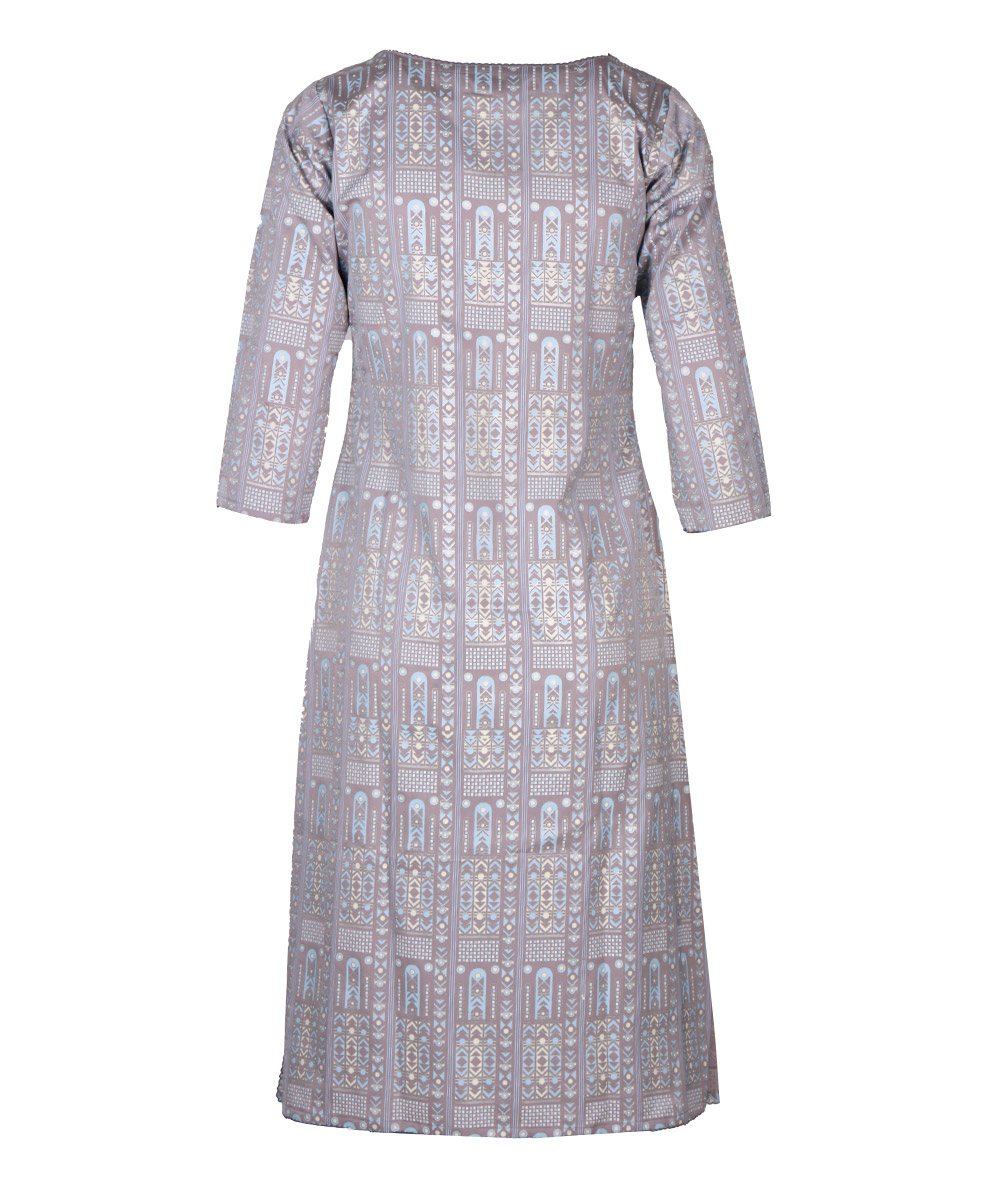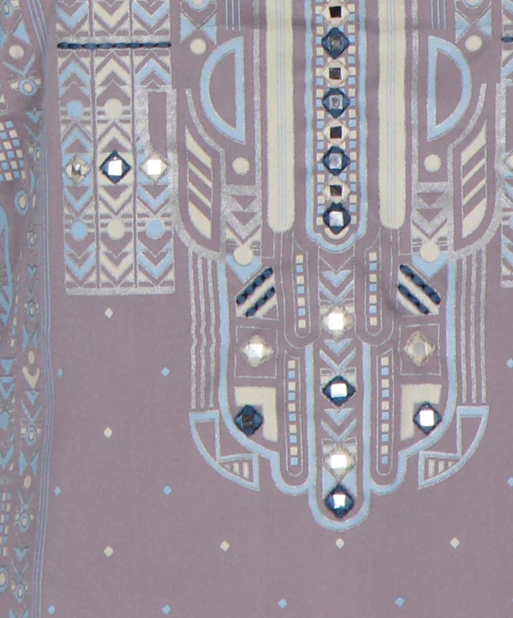 Silver velveteen kameez with allover ethnic print and embroidery at front.