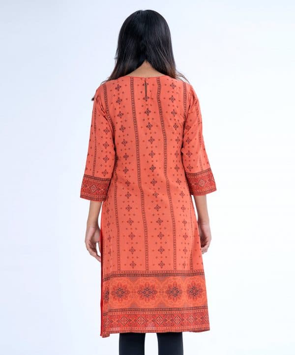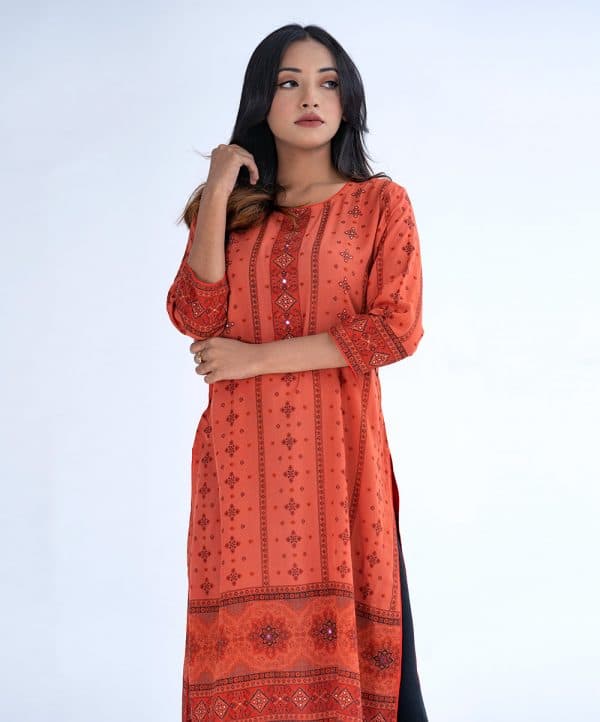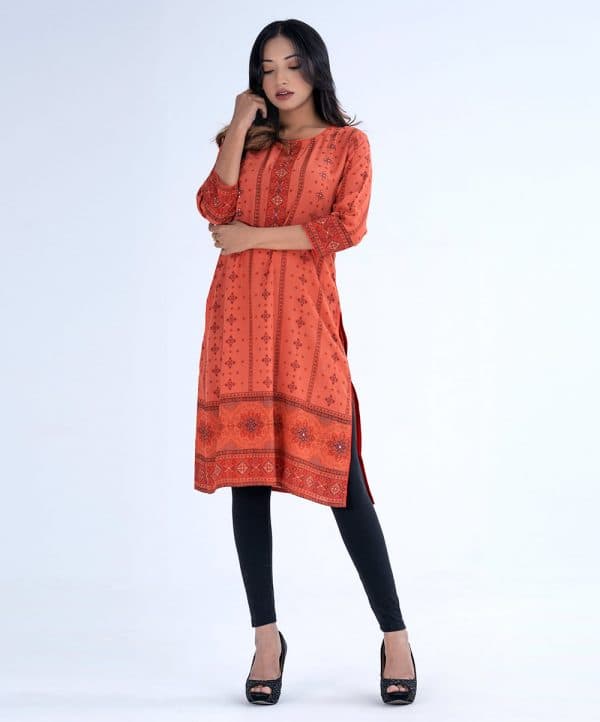 Orange all-over printed Straight-cut Kameez in Viscose fabric. Designed with a round neck and three-quarter sleeves. Embellished with karchupi at the front and cuffs.