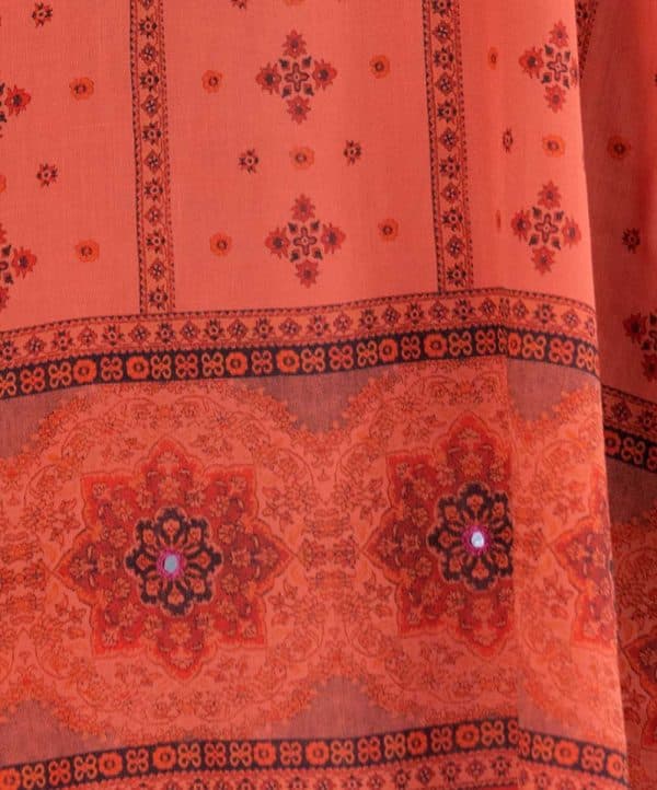 Orange all-over printed Straight-cut Kameez in Viscose fabric. Designed with a round neck and three-quarter sleeves. Embellished with karchupi at the front and cuffs.