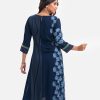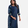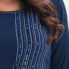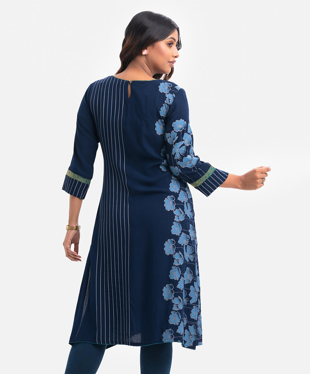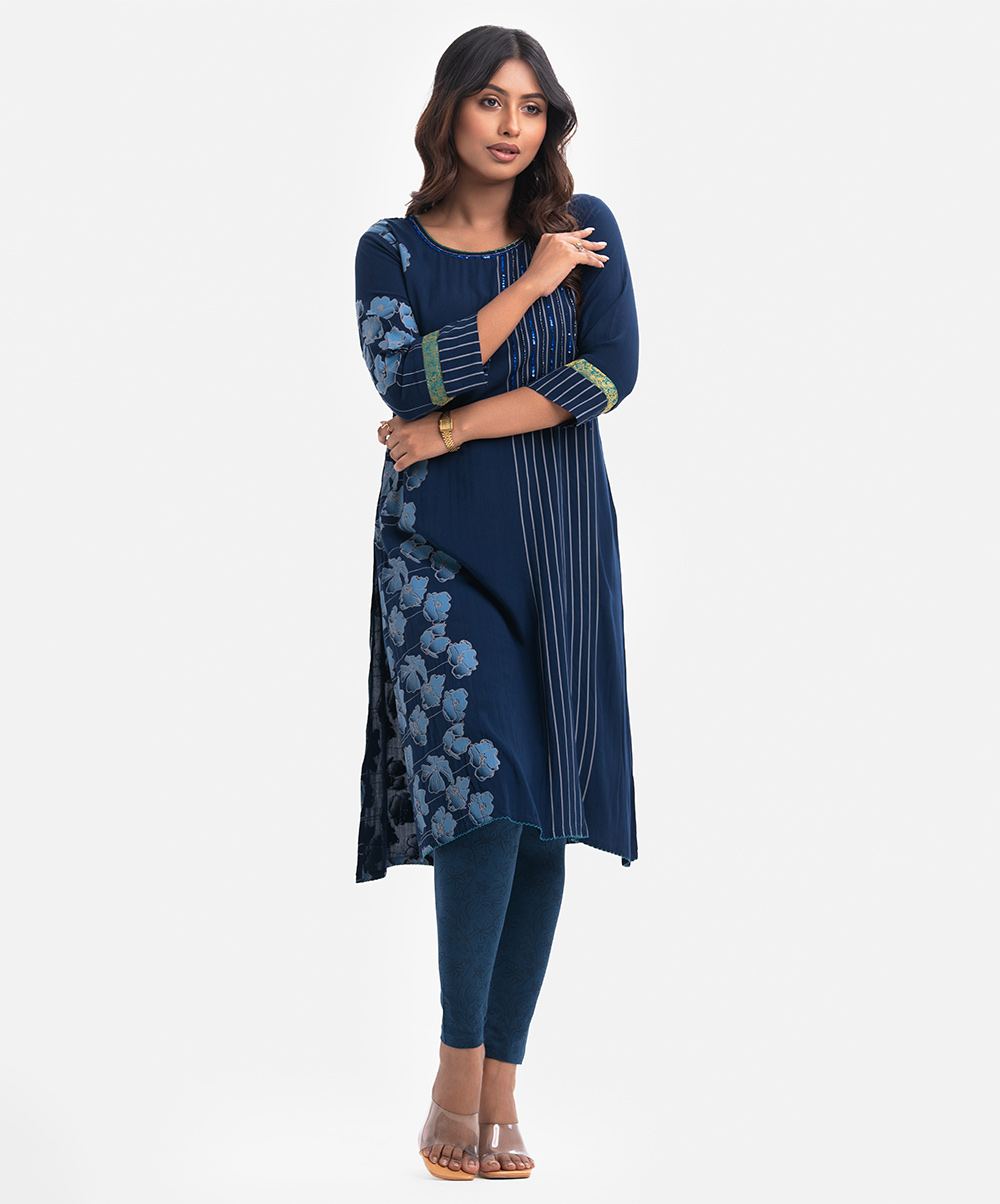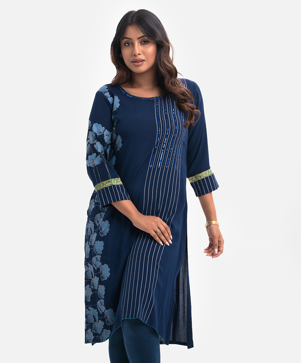 Women’s printed A-line kameez in viscose fabric. Boat neck, full sleeves. Karchupi at front and patchwork at neckline & sleeves.